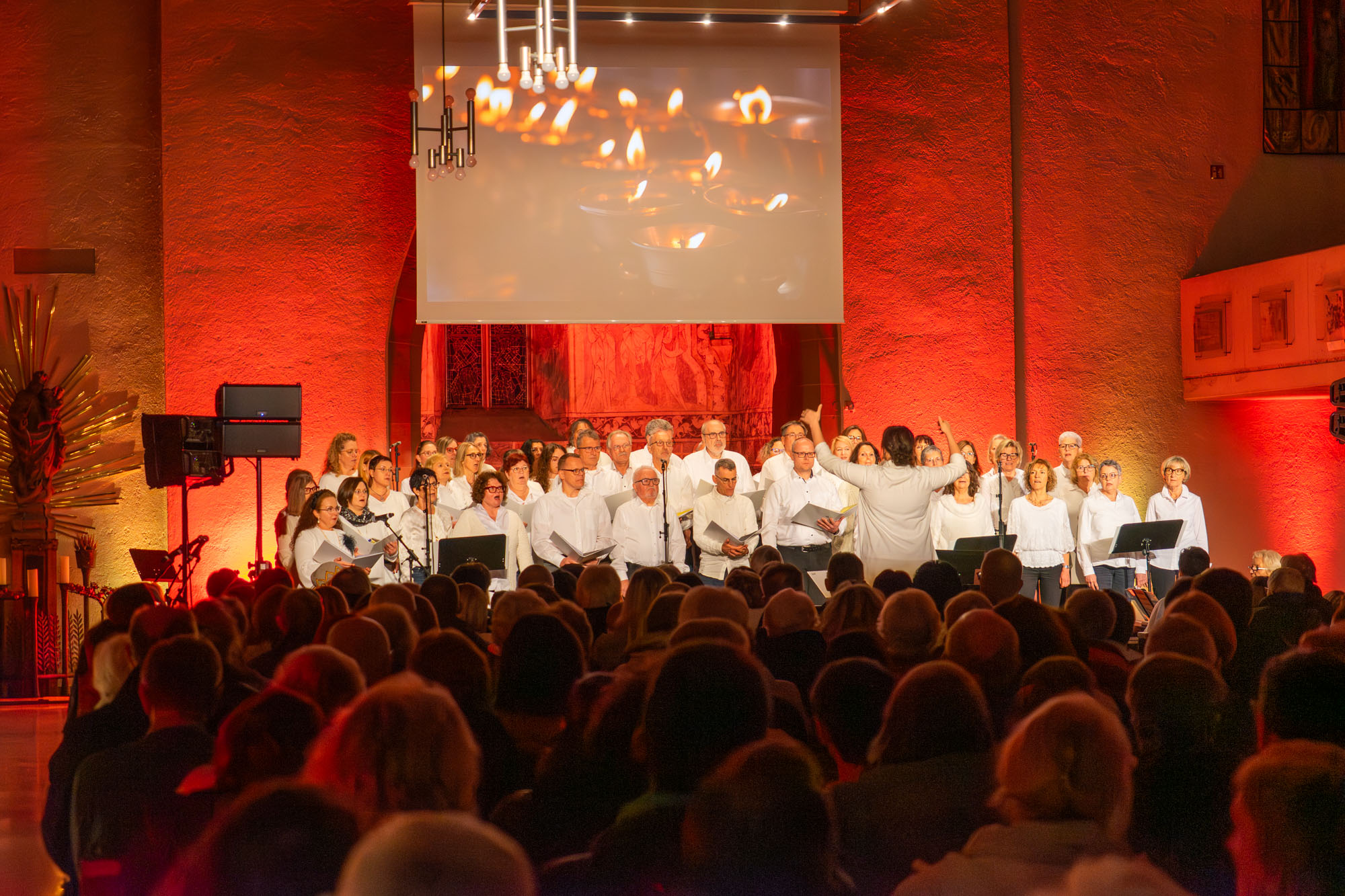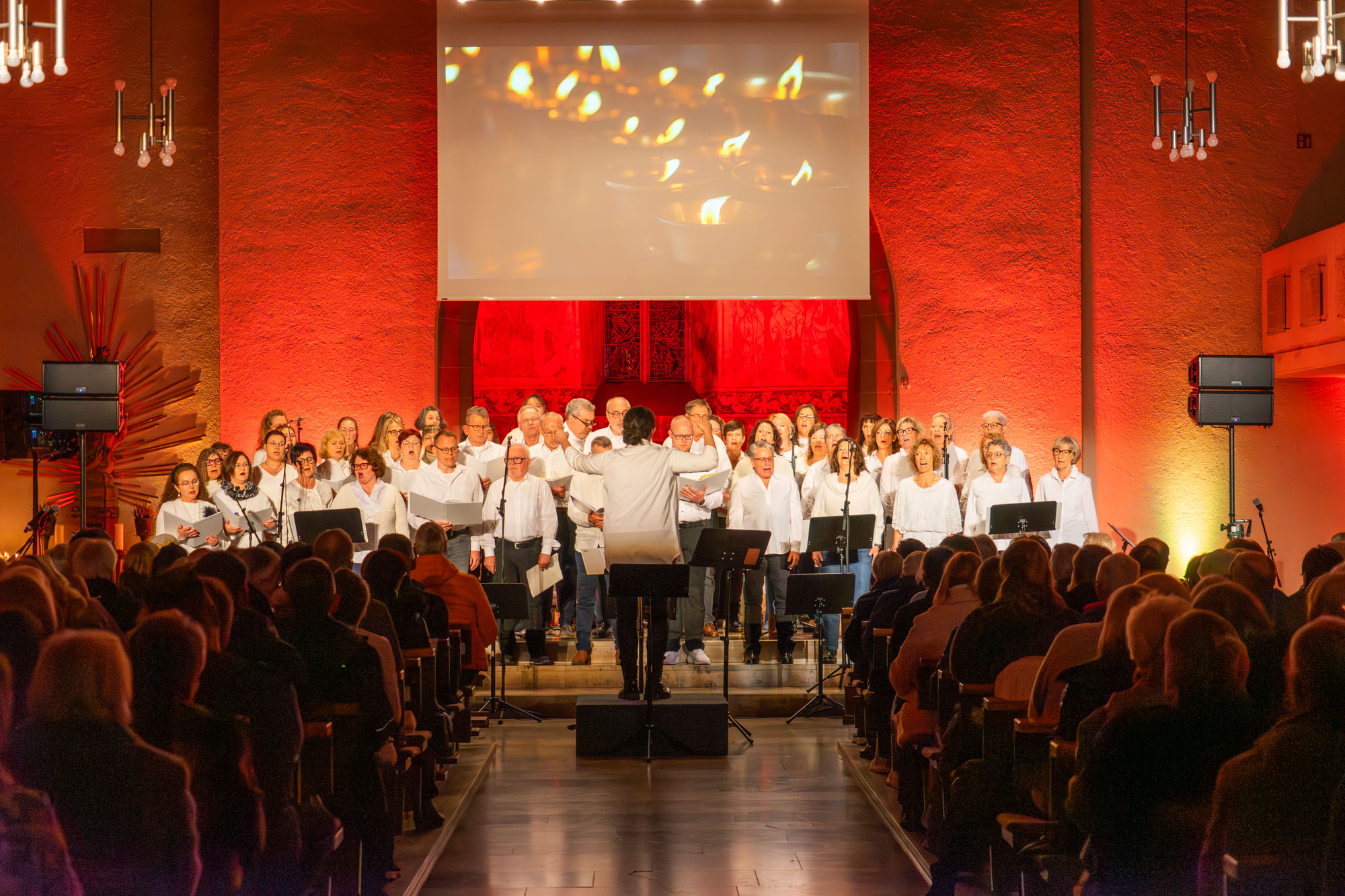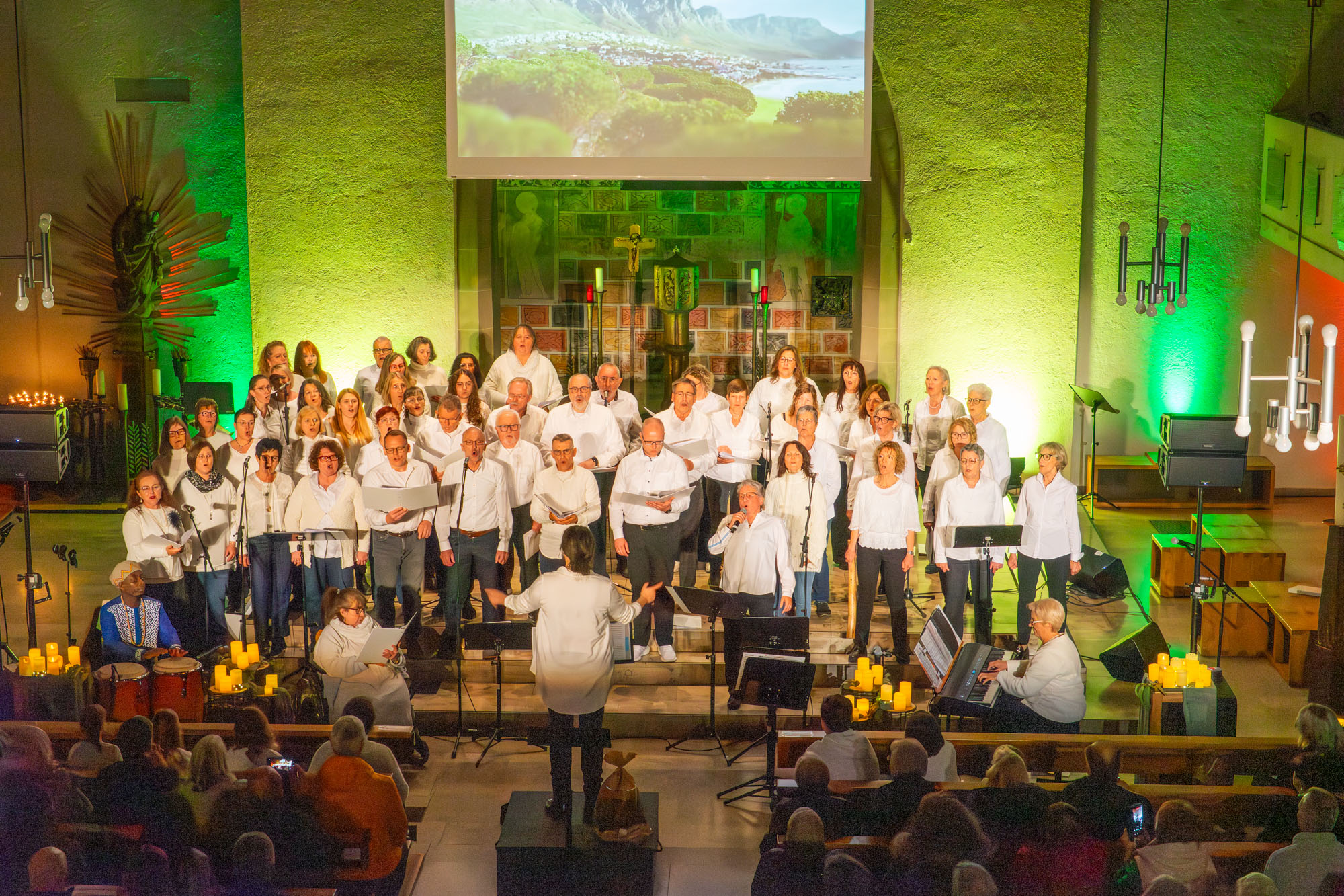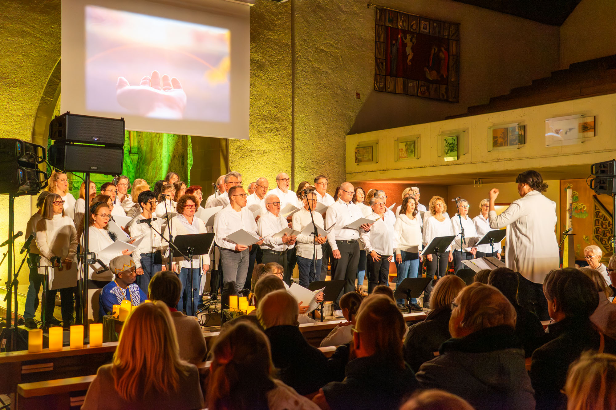 Pünktlich um 19 Uhr versammelten sich die knapp 60 „Kraichgau Singers“ um den Altar der Katholischen Stadtkirche und eröffneten mit dem Filmmusiktitel „Conquest Of Paradise“ einen Konzertabend der Extraklasse. Er wurde bereichert durch Videoeinspielungen auf einer großen Leinwand über dem Altar und schließlich sogar dem Text von „Ode an die Freude“ beim großen Finale.