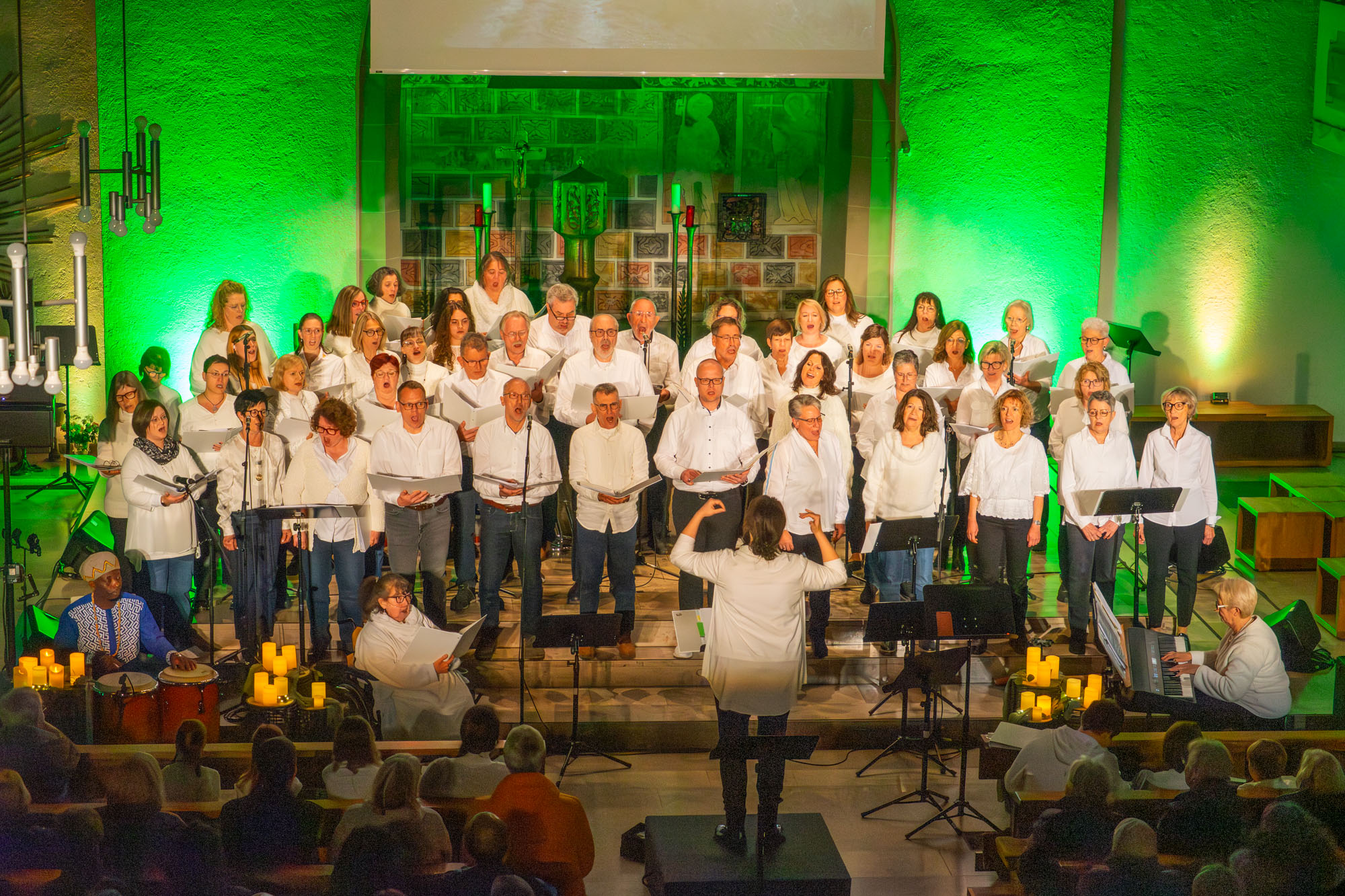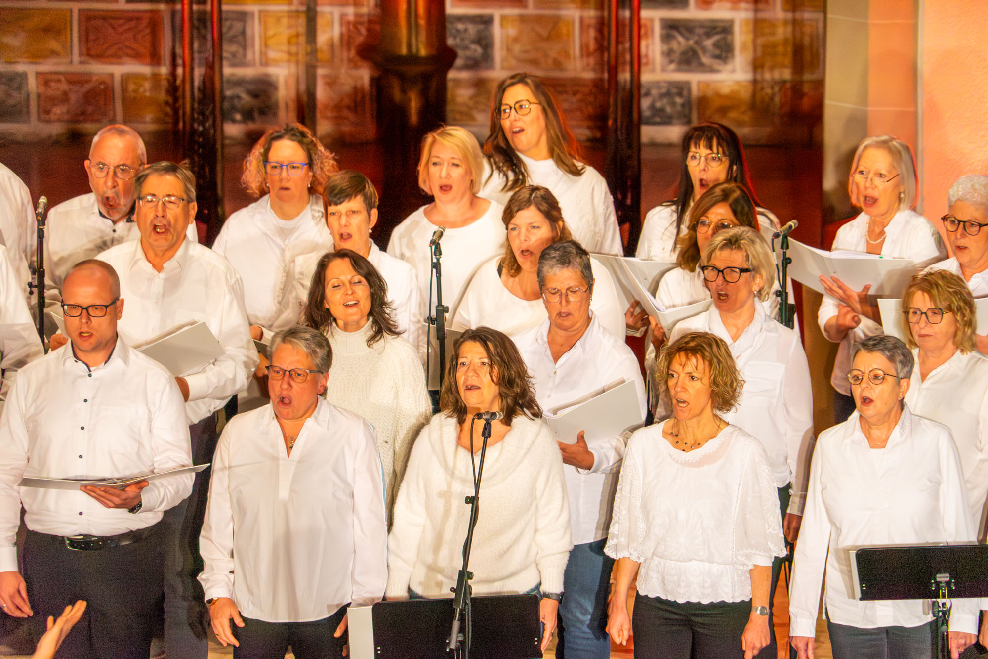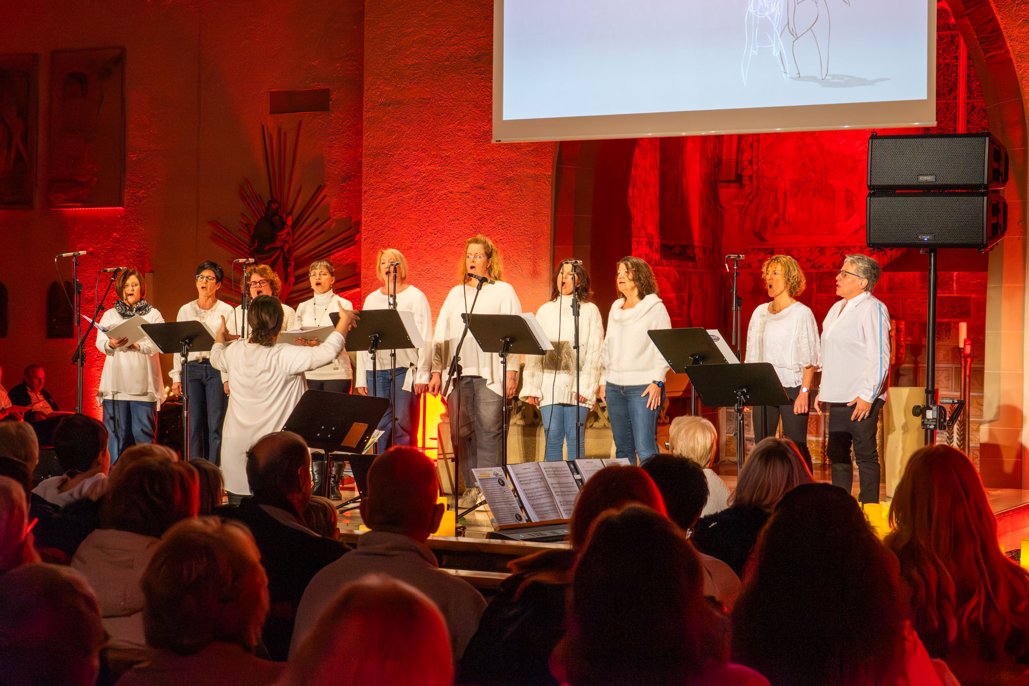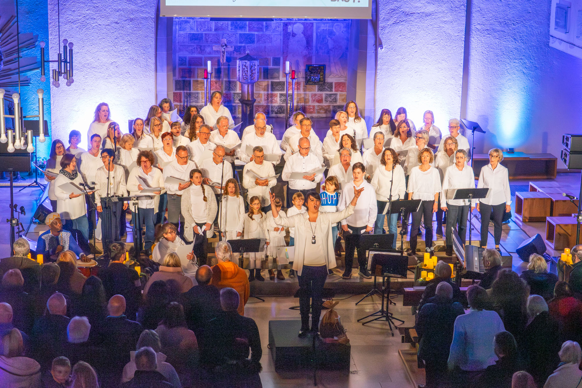 Pünktlich um 19 Uhr versammelten sich die knapp 60 „Kraichgau Singers“ um den Altar der Katholischen Stadtkirche und eröffneten mit dem Filmmusiktitel „Conquest Of Paradise“ einen Konzertabend der Extraklasse. Er wurde bereichert durch Videoeinspielungen auf einer großen Leinwand über dem Altar und schließlich sogar dem Text von „Ode an die Freude“ beim großen Finale.