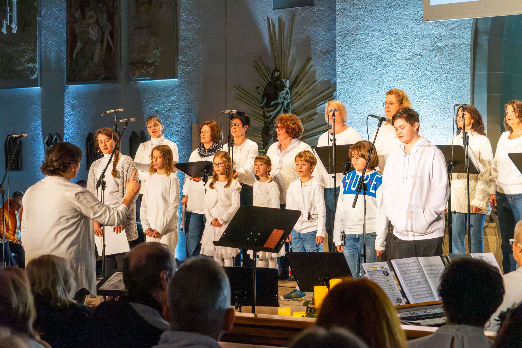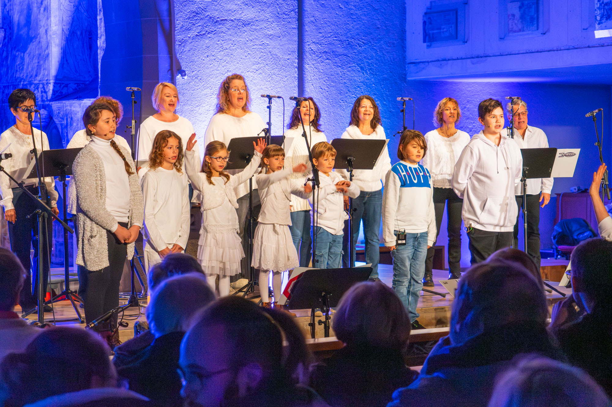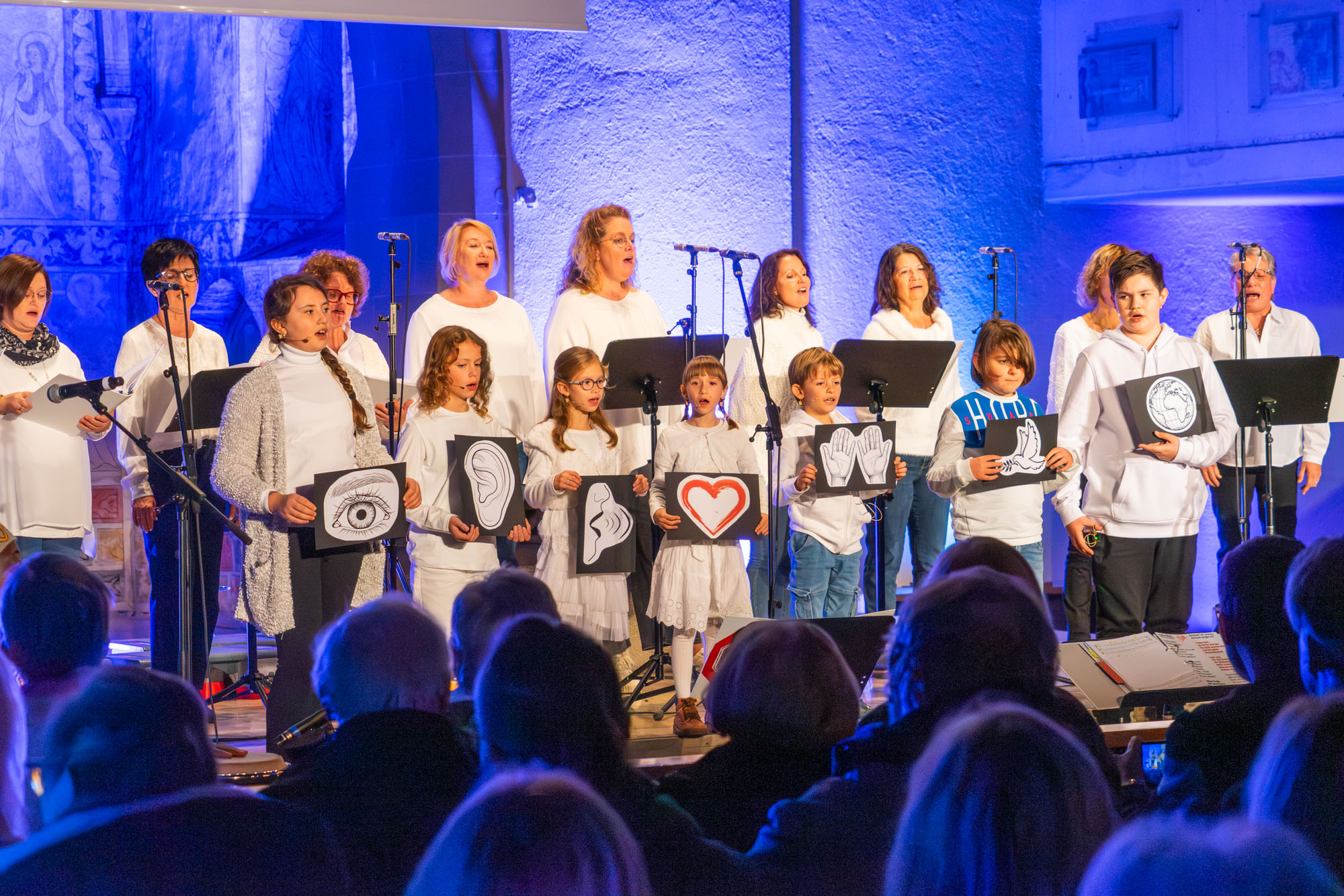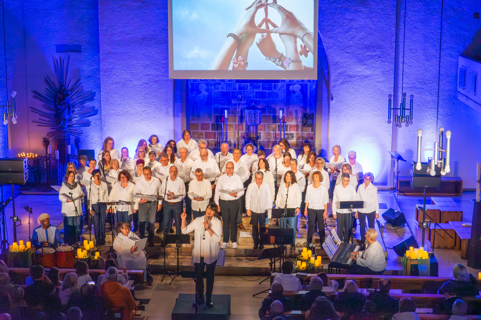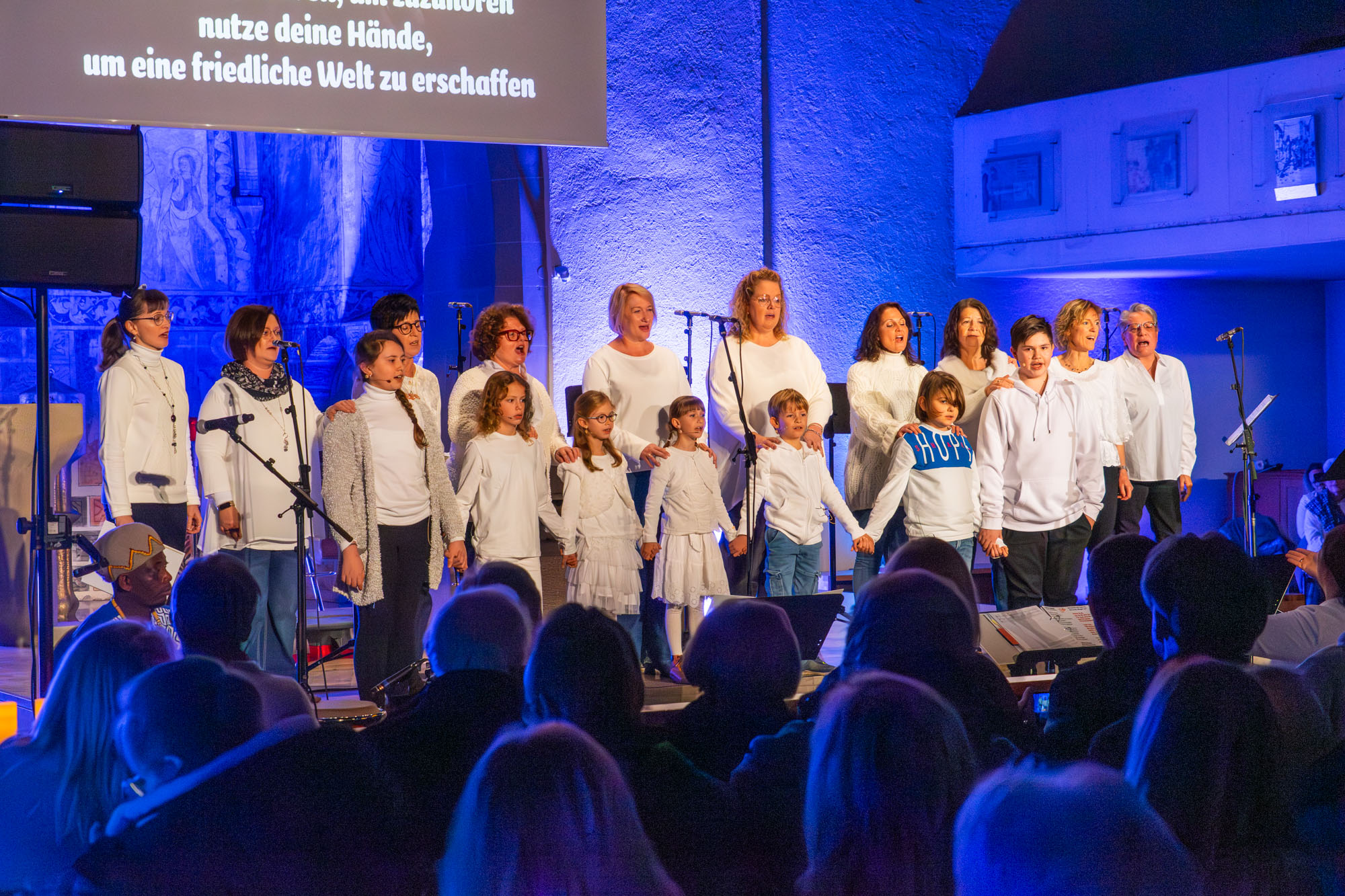 Dann bewiesen die acht Sänger von „Only Men“, dass sie nicht nur Popsongs wie „Wonderful World“ oder „Lonesome Road“ beherrschen, sondern auch klassische Männerchorsätze beeindruckend vortragen können wie „Frieden“ und „Abschied vom Walde“. Anschließend sangen die elf Ladies von „Burn“ den Billy-Joel-Titel „And So It Goes“, der auf eine schottische Ballade zurückgeht, sowie „Gabriellas Song“, bevor sich die acht „KidZ 4 Peace“ zu ihnen gesellten. Gemeinsam stimmten sie Michael Jacksons Riesenhit „Heal The World“ an sowie den weniger bekannten Protestsong „Weiße Fahnen“. Manche Anwesende werteten diesen Auftritt als nächsten Programmhöhepunkt. Und es war in der Tat beeindruckend, wie unbekümmert und selbstsicher sich die Mädchen und Jungs präsentierten – trotz der sicherlich ungewohnten Headsets und in Anbetracht der gut gefüllten Kirchenbänke.