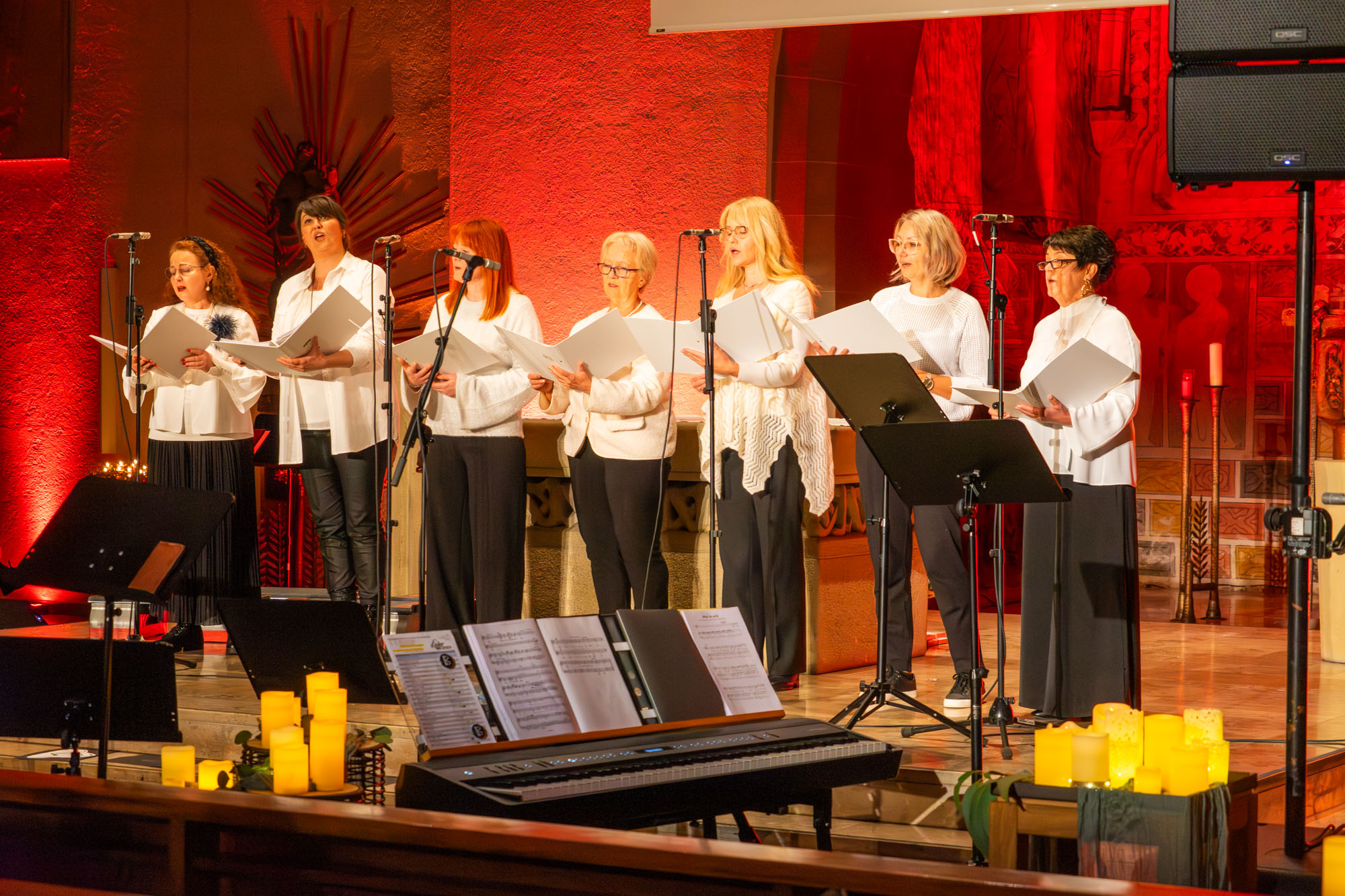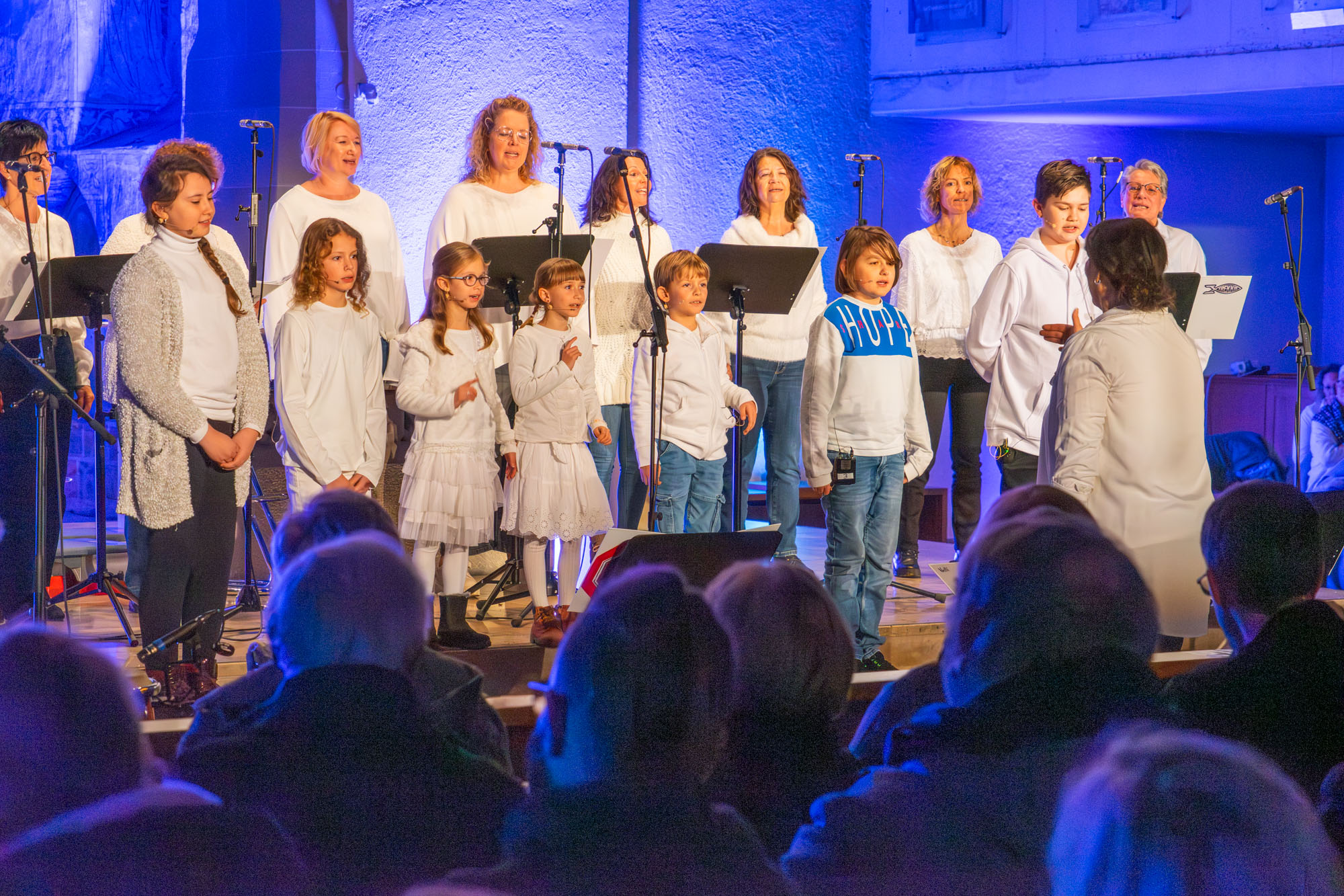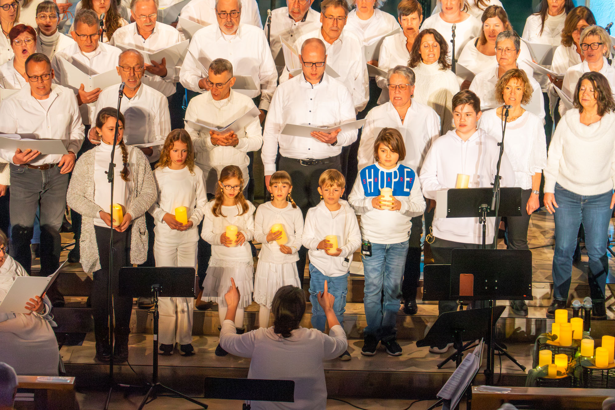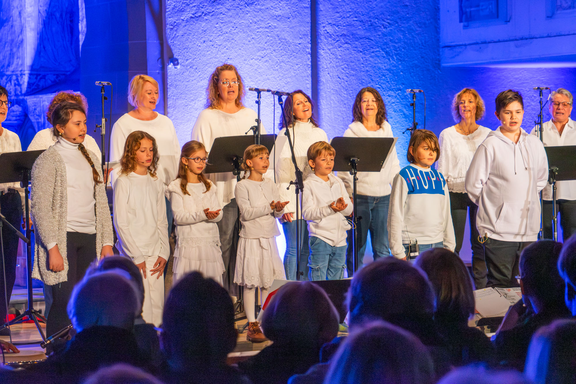 Dann bewiesen die acht Sänger von „Only Men“, dass sie nicht nur Popsongs wie „Wonderful World“ oder „Lonesome Road“ beherrschen, sondern auch klassische Männerchorsätze beeindruckend vortragen können wie „Frieden“ und „Abschied vom Walde“. Anschließend sangen die elf Ladies von „Burn“ den Billy-Joel-Titel „And So It Goes“, der auf eine schottische Ballade zurückgeht, sowie „Gabriellas Song“, bevor sich die acht „KidZ 4 Peace“ zu ihnen gesellten. Gemeinsam stimmten sie Michael Jacksons Riesenhit „Heal The World“ an sowie den weniger bekannten Protestsong „Weiße Fahnen“. Manche Anwesende werteten diesen Auftritt als nächsten Programmhöhepunkt. Und es war in der Tat beeindruckend, wie unbekümmert und selbstsicher sich die Mädchen und Jungs präsentierten – trotz der sicherlich ungewohnten Headsets und in Anbetracht der gut gefüllten Kirchenbänke.
