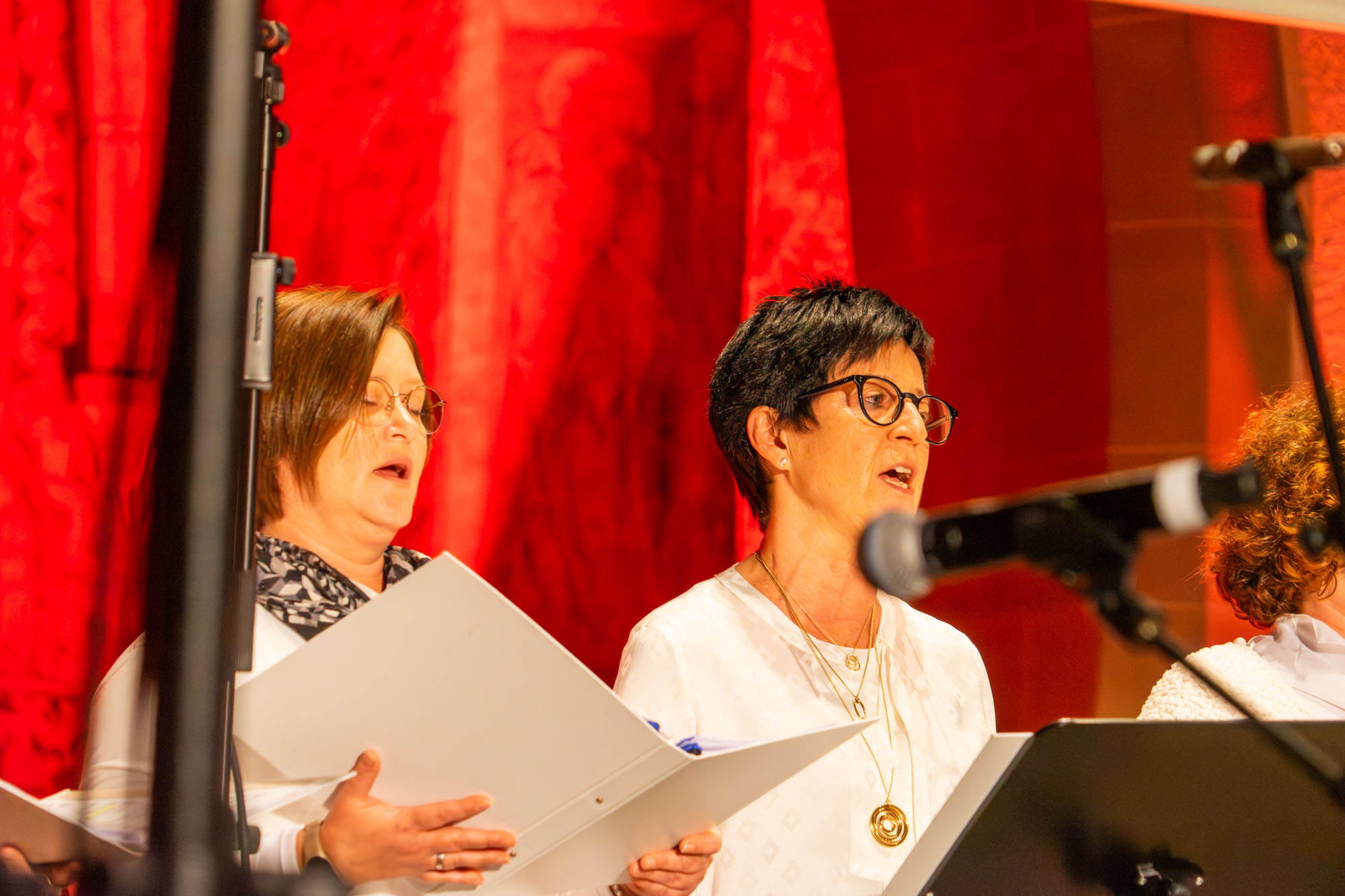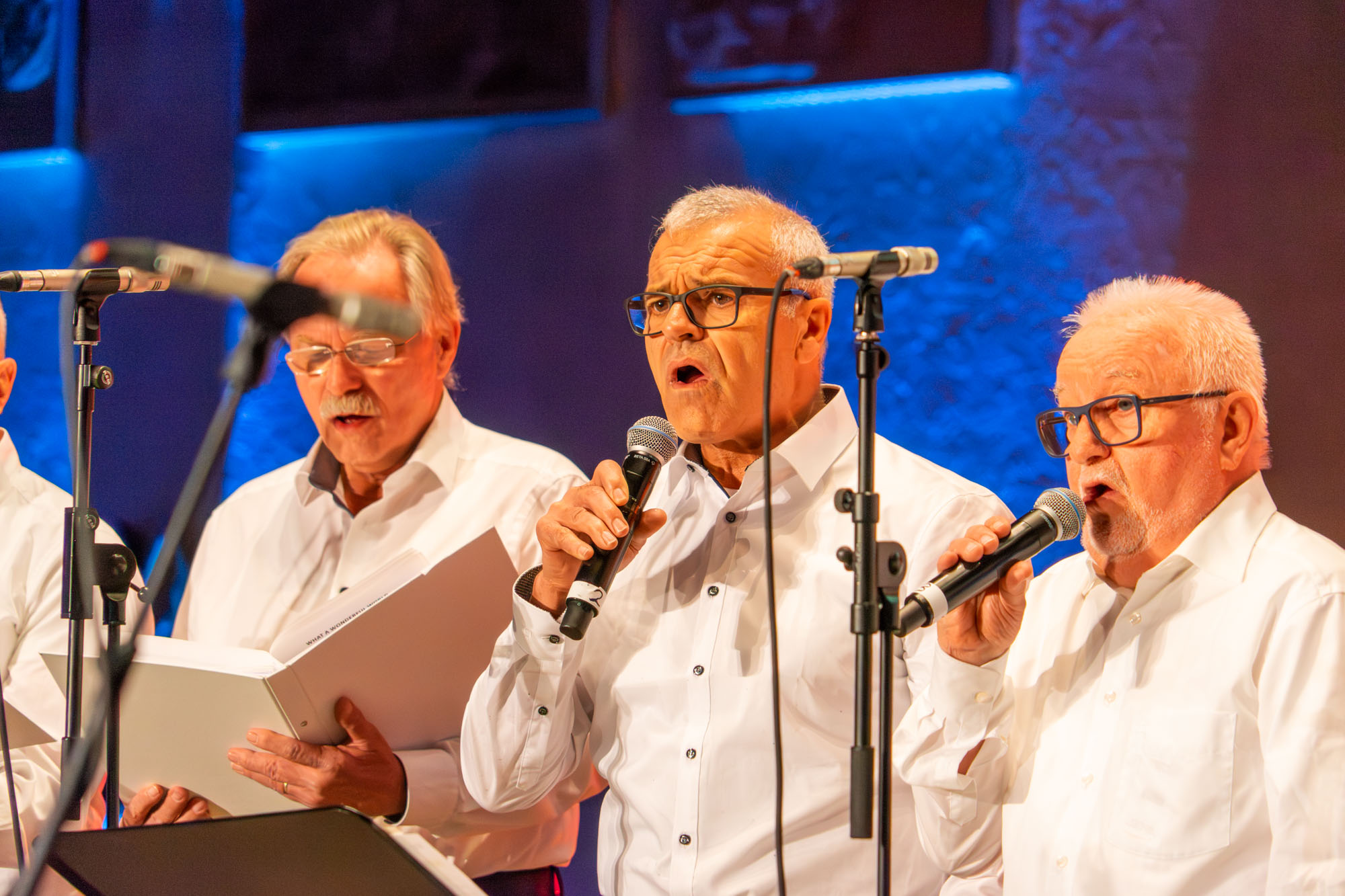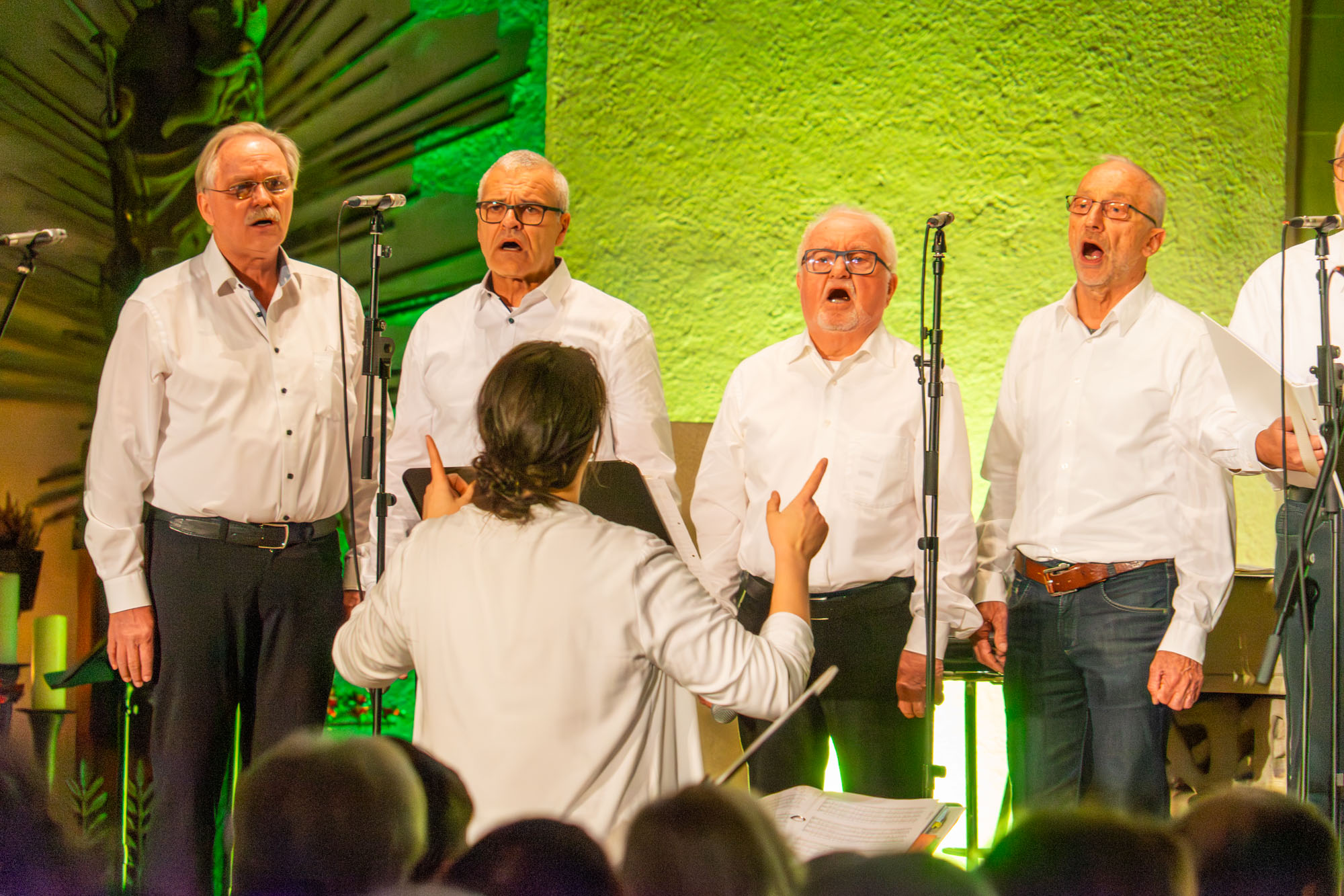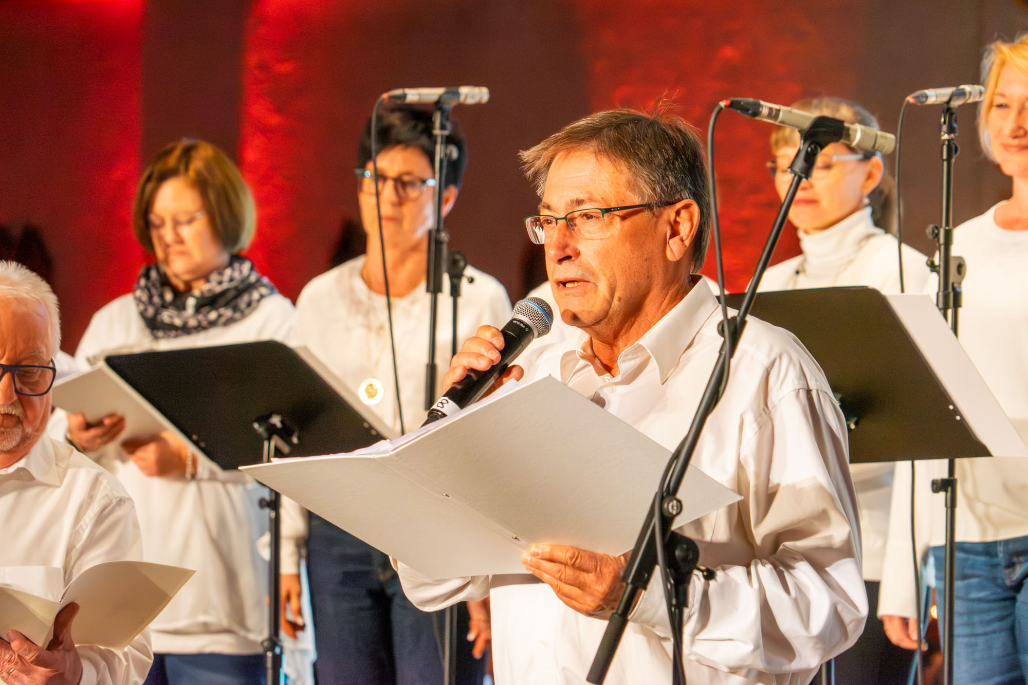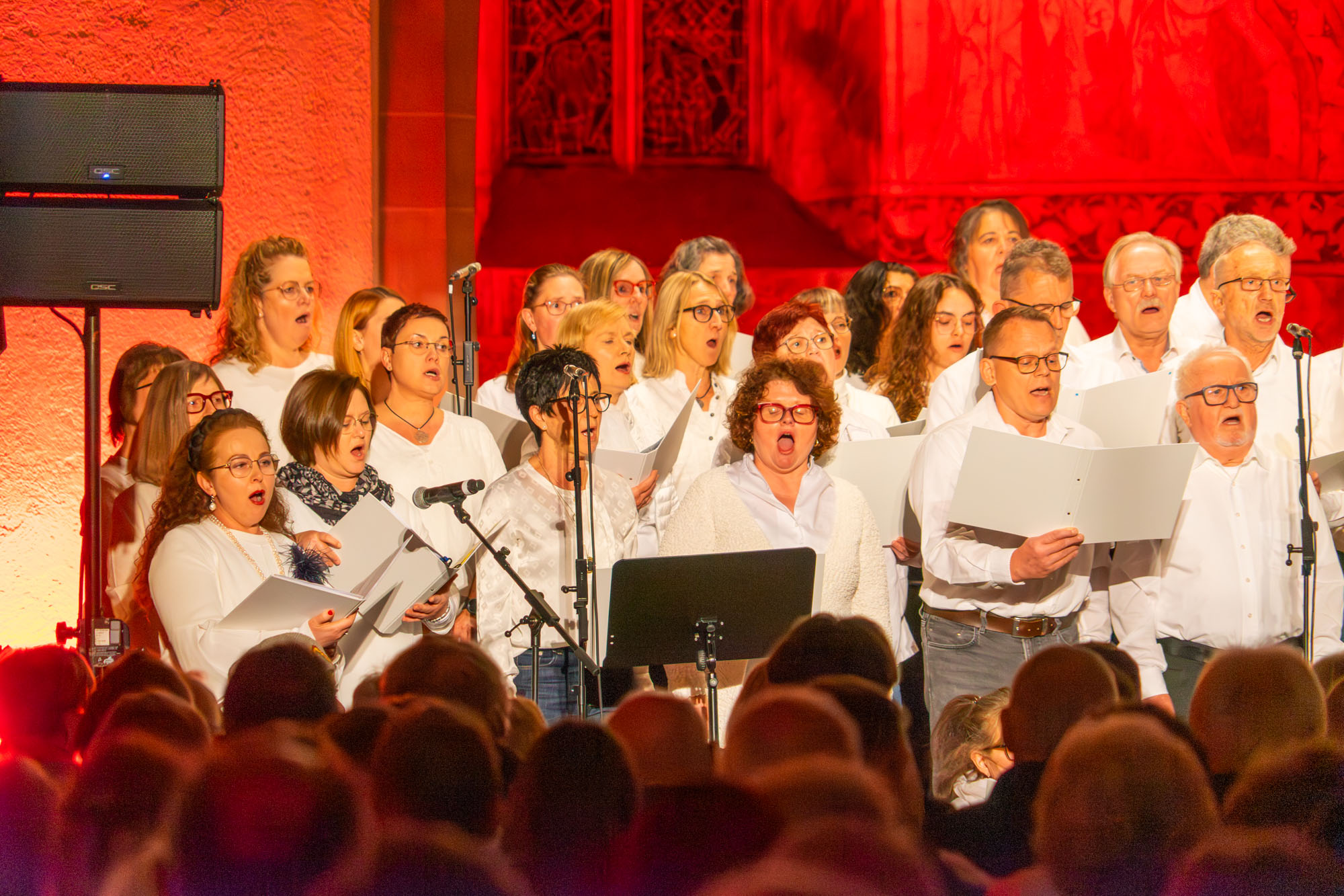 Dann bewiesen die acht Sänger von „Only Men“, dass sie nicht nur Popsongs wie „Wonderful World“ oder „Lonesome Road“ beherrschen, sondern auch klassische Männerchorsätze beeindruckend vortragen können wie „Frieden“ und „Abschied vom Walde“. Anschließend sangen die elf Ladies von „Burn“ den Billy-Joel-Titel „And So It Goes“, der auf eine schottische Ballade zurückgeht, sowie „Gabriellas Song“, bevor sich die acht „KidZ 4 Peace“ zu ihnen gesellten. Gemeinsam stimmten sie Michael Jacksons Riesenhit „Heal The World“ an sowie den weniger bekannten Protestsong „Weiße Fahnen“. Manche Anwesende werteten diesen Auftritt als nächsten Programmhöhepunkt. Und es war in der Tat beeindruckend, wie unbekümmert und selbstsicher sich die Mädchen und Jungs präsentierten – trotz der sicherlich ungewohnten Headsets und in Anbetracht der gut gefüllten Kirchenbänke.