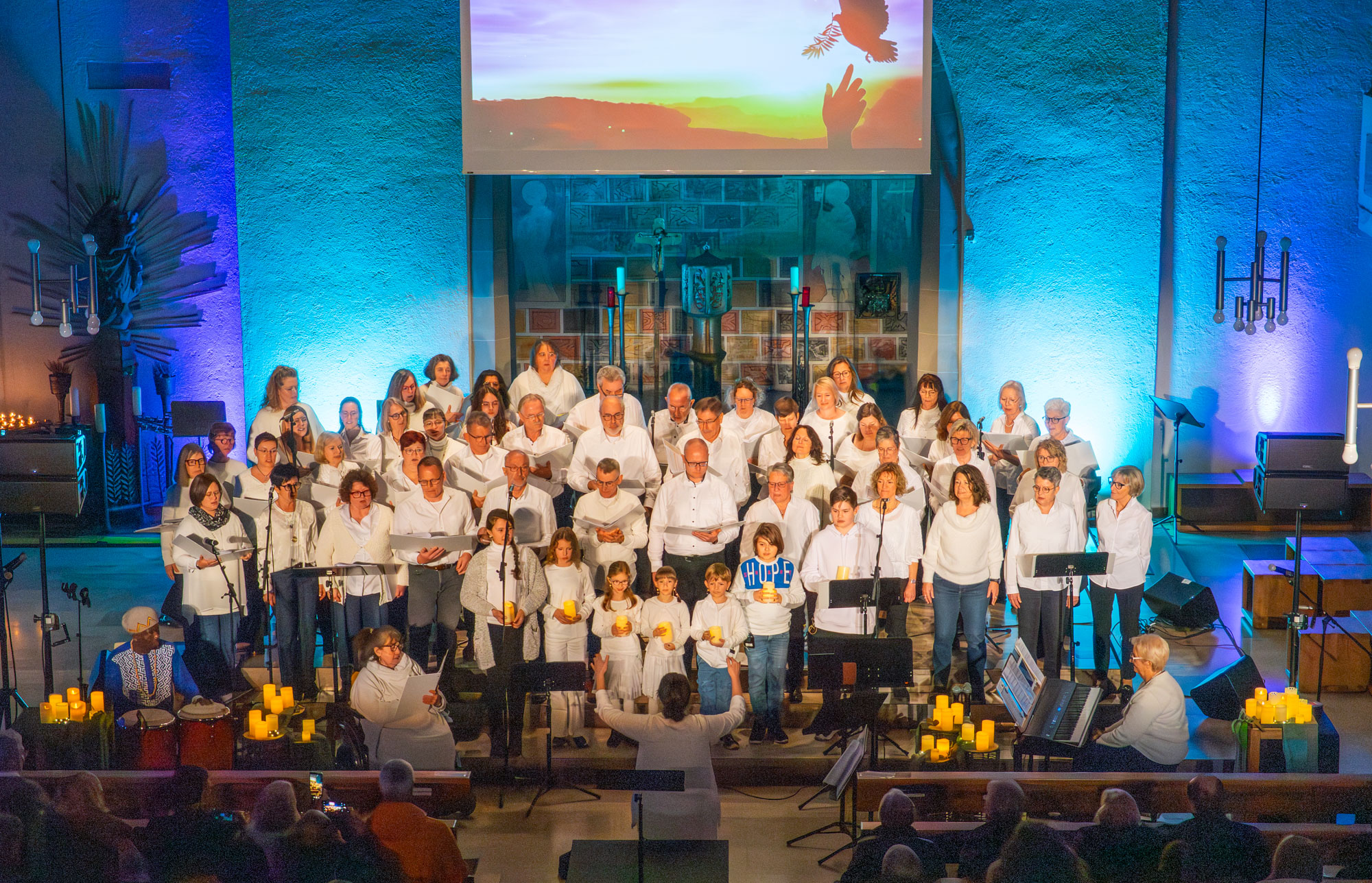 Dann folgte das furiose Finale des Abends: Zunächst erklang das in der afrikanischen Sprache Swahili gesungene „Baba Yetu“ (Vater Unser) mit den Solistinnen Marion Eyer und Lilia Urbach. Bei dem vorletzten Titel des Abends „Hoffnung“ von Peter Maffay kamen die „KidZ 4 Peace“ nochmals nach vorn und sangen kräftig mit. Und den Schlusstitel „Ode an die Freunde“ schmetterten alle Akteure und das Publikum gemeinsam. Dank der Einspielung des Textes auf der Leinwand gab es keinerlei Textprobleme. Zahlreiche Besucherinnen und Besucher lobten gleich im Anschluss in Gesprächen mit den Akteuren und den Vereinsverantwortlichen die gelungene Veranstaltung überschwänglich und bedankten sich für einen sehr schönen Abend.