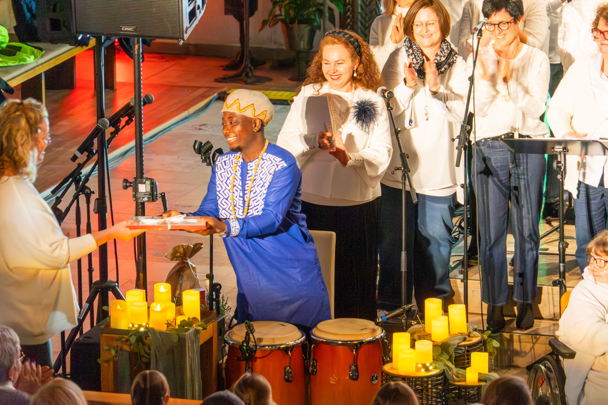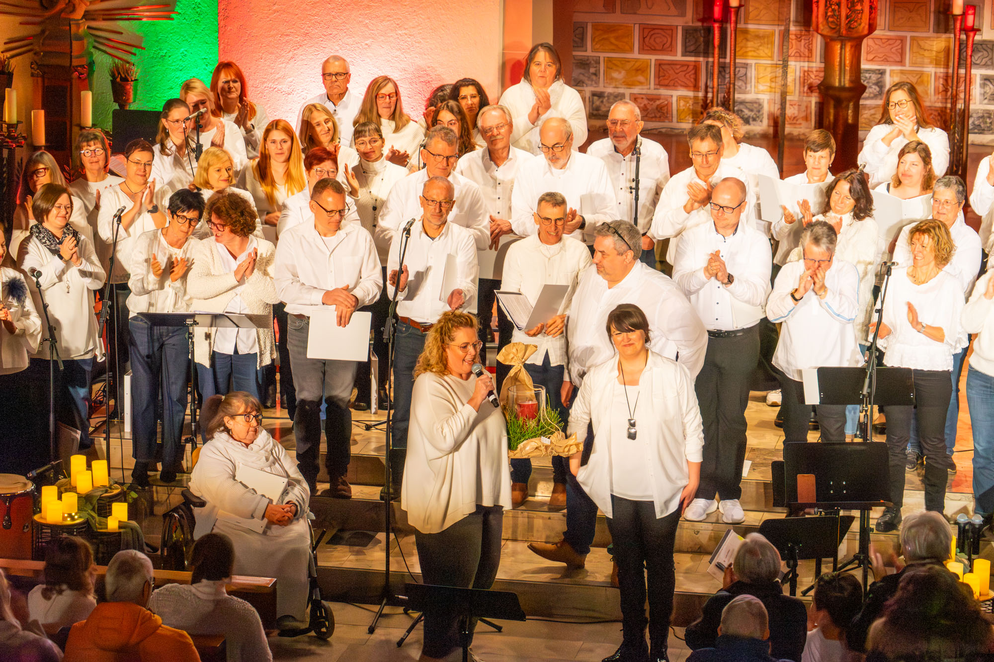 In seinem Schlusswort bedankte sich Stefan Holzki bei allen mitwirkenden Akteuren. Ausdrücklich hob er dabei Elisabeth Zich für ihre virtuose Begleitung der Ensembles am E-Piano sowie den afrikanischen Trommler Tepe für seine einfühlsame Untermalung hervor. Der Dank des Vereinschefs richtete sich ebenfalls an die Katholische Kirchengemeinde Eppingen für die Überlassung der Kirche zu diesem Konzert, an die Stebbacher Firma „MF-Technik“ für Licht und Ton sowie an alle HelferInnen vor und hinter den Kulissen. Er lud alle Anwesenden noch zu einem kurzfristig organisierten Umtrunk im Hof der „Katharinenkapelle“ ein. Den herzlichen Dank aller mitwirkenden Chöre an Nelli für ihr enormes und keineswegs selbstverständliches Engagement bei der Konzeption und der Realisierung des Konzerts „Lieder ohne Grenzen“ übernahm Vorstandsmitglied Daniela Gärtner. Sie tat dies.mit treffenden Worten und überreichte der Chorleiterin ein Geschenk.