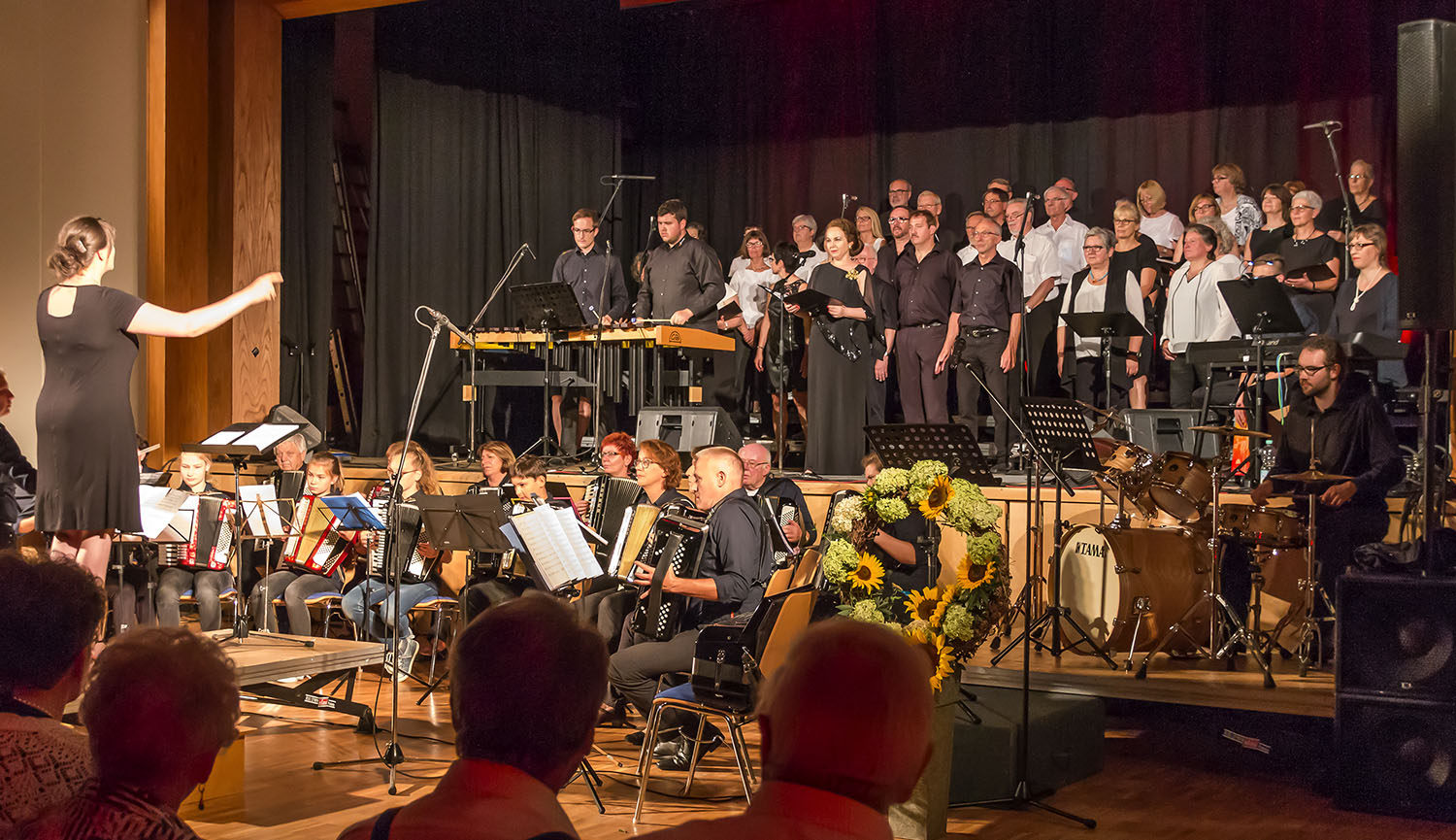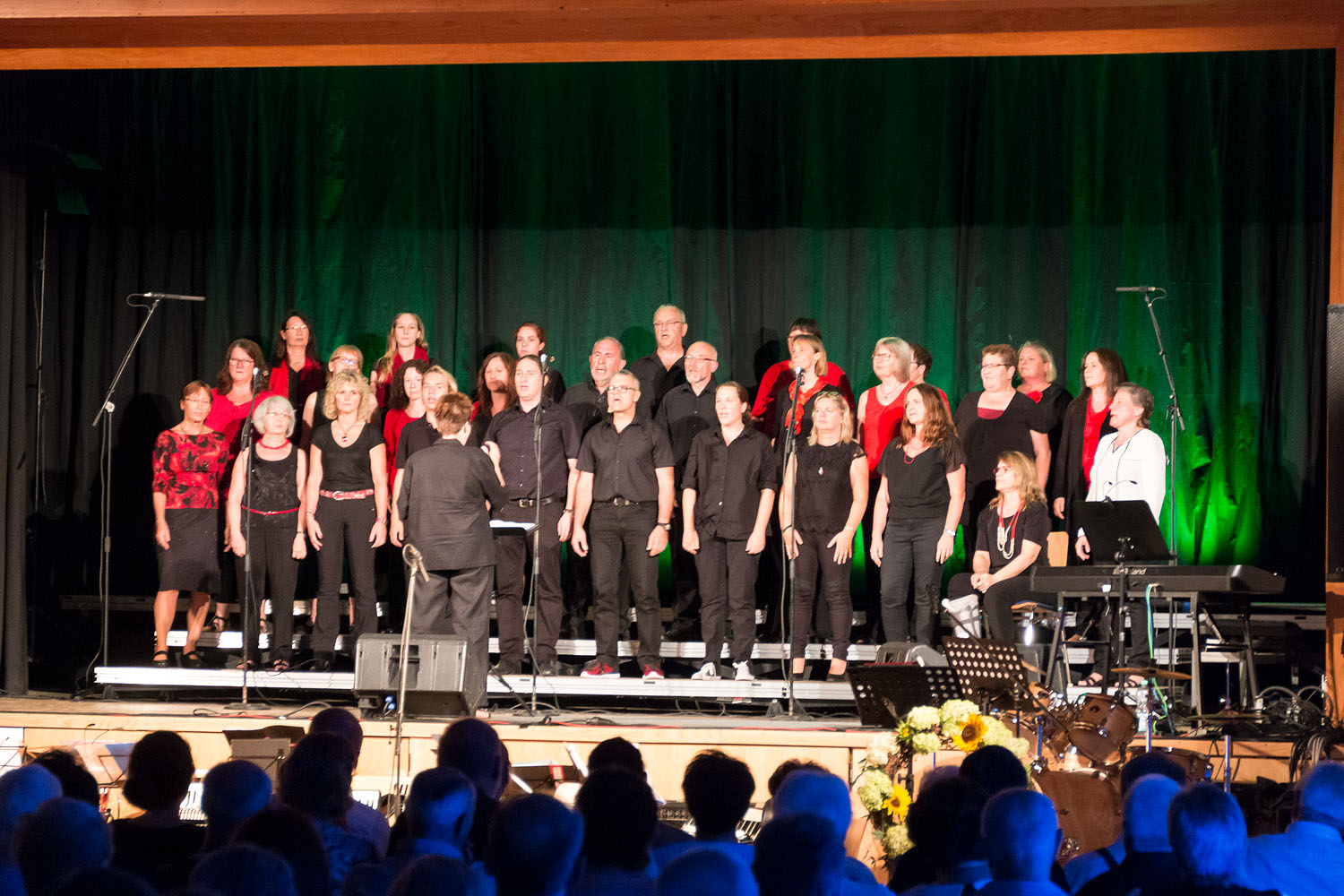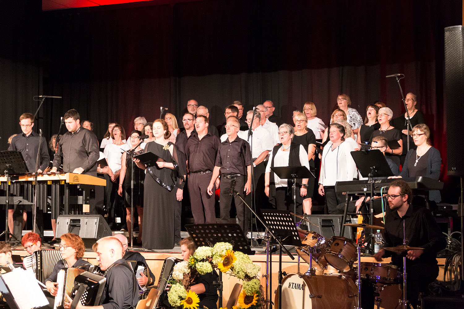 Die „Kraichgau Singers“ unter der Leitung von Nelli Holzki eröffneten das Programm mit der Pop-Ballade „Über'n See“. Danach schlug die Stunde der beiden Moderatoren Reinhard Dutzi und Roland Schölch, die souverän, locker und humorvoll durch den Abend führten. Sie beleuchteten in mehreren kurzen Blöcken die Vereinsgeschichte, wobei ihre Ausführungen von zahlreichen Fotos auf der Großleinwand unterstrichen wurden. Das Männerensemble „Only Men“ - ebenfalls unter der Leitung von Nelli Holzki - trug das „Bürgerlied“ vor, die Hymne der nationalliberalen Bewegung (Ziele u.a. die Abschaffung der Stände, Schaffung eines vereinigten Deutschlands), zu der damals die Gesangvereine gehörten. Aus jener Zeit stammt auch das Volkslied „Die Gedanken sind frei“, das die Sängerinnen und Sänger gemeinsam mit dem Publikum intonierten. Damals war der Gesang offenkundig eine hochpolitische Angelegenheit und nur den Herren der Schöpfung vorbehalten, was die Akteure von „Only Men“ mit dem Grönemeyer-Hit „Männer“ unterstrichen. Anschließend spielte das Akkordeonorchester Brackenheim „Skataco“ (kein Schreibfehler, sondern ein Wortspiel!), „Air“ und „Der 3. Mann“. Die „Kraichgau Singers“ boten danach Musik aus den 30er Jahren dar – am E-Piano begleitet von Tatjana Ruppert. Bei „Summertime“ sorgte Solistin Lilia Urbach mit ihrer weichen Sopranstimme bei den Zuhörern für Gänsehaut-Feeling. Und bei „Sing, Sing, Sing“ sprang der Funke über und die ganze Stadthalle swingte mit.