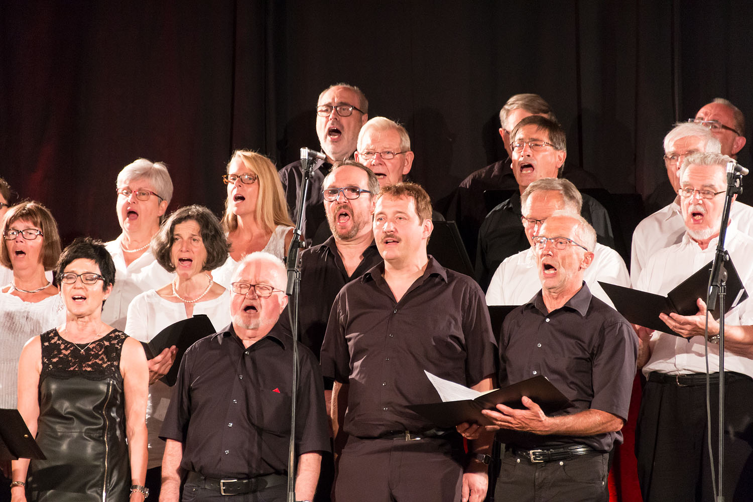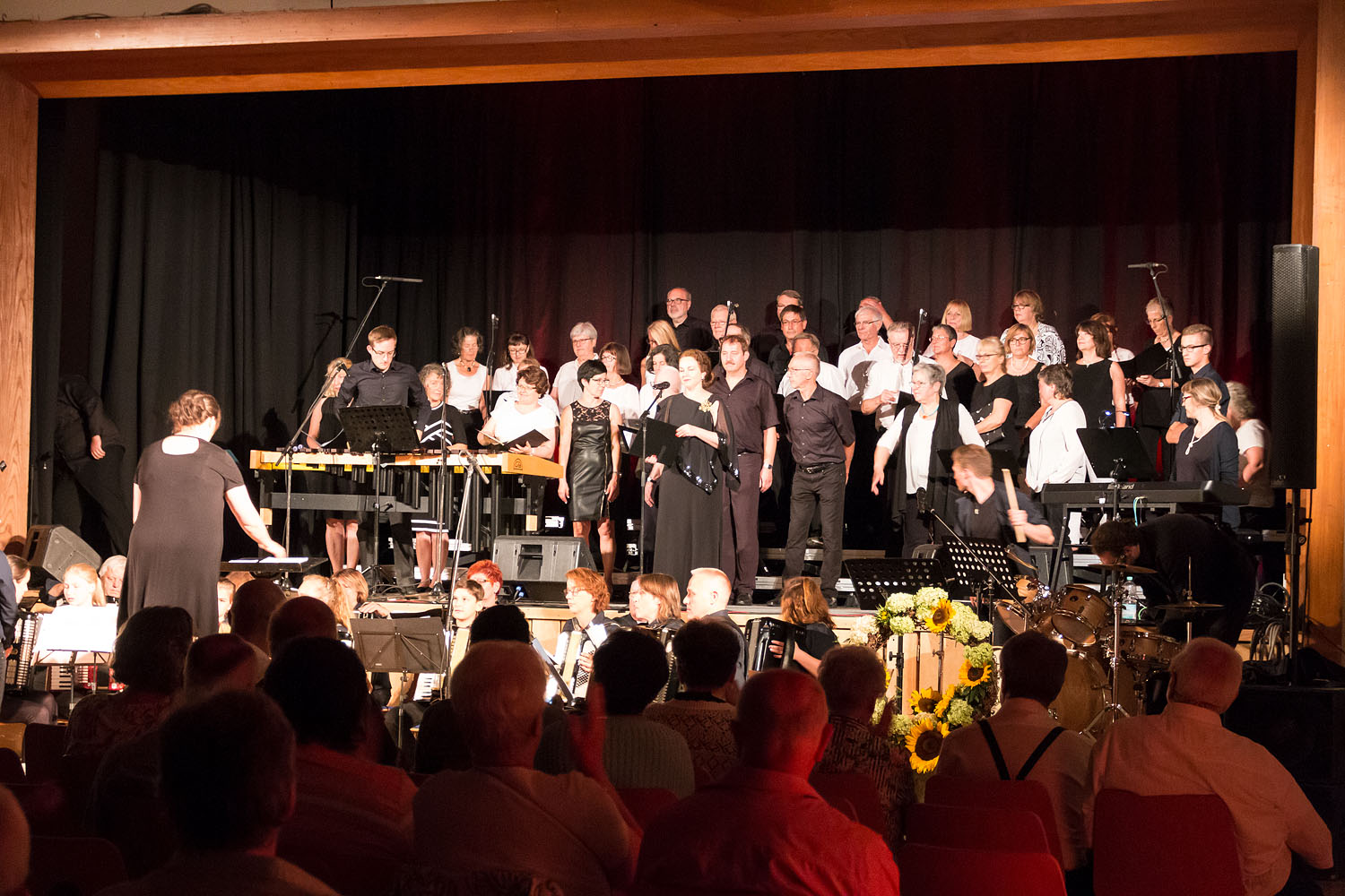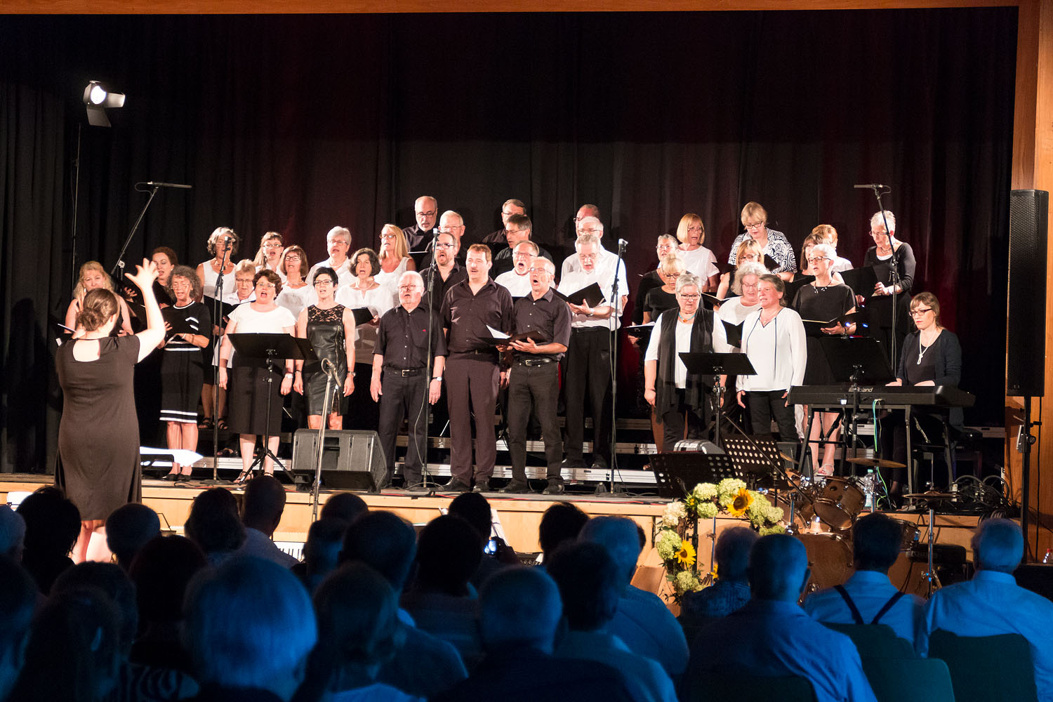 Die „Kraichgau Singers“ unter der Leitung von Nelli Holzki eröffneten das Programm mit der Pop-Ballade „Über'n See“. Danach schlug die Stunde der beiden Moderatoren Reinhard Dutzi und Roland Schölch, die souverän, locker und humorvoll durch den Abend führten. Sie beleuchteten in mehreren kurzen Blöcken die Vereinsgeschichte, wobei ihre Ausführungen von zahlreichen Fotos auf der Großleinwand unterstrichen wurden. Das Männerensemble „Only Men“ - ebenfalls unter der Leitung von Nelli Holzki - trug das „Bürgerlied“ vor, die Hymne der nationalliberalen Bewegung (Ziele u.a. die Abschaffung der Stände, Schaffung eines vereinigten Deutschlands), zu der damals die Gesangvereine gehörten. Aus jener Zeit stammt auch das Volkslied „Die Gedanken sind frei“, das die Sängerinnen und Sänger gemeinsam mit dem Publikum intonierten. Damals war der Gesang offenkundig eine hochpolitische Angelegenheit und nur den Herren der Schöpfung vorbehalten, was die Akteure von „Only Men“ mit dem Grönemeyer-Hit „Männer“ unterstrichen. Anschließend spielte das Akkordeonorchester Brackenheim „Skataco“ (kein Schreibfehler, sondern ein Wortspiel!), „Air“ und „Der 3. Mann“. Die „Kraichgau Singers“ boten danach Musik aus den 30er Jahren dar – am E-Piano begleitet von Tatjana Ruppert. Bei „Summertime“ sorgte Solistin Lilia Urbach mit ihrer weichen Sopranstimme bei den Zuhörern für Gänsehaut-Feeling. Und bei „Sing, Sing, Sing“ sprang der Funke über und die ganze Stadthalle swingte mit.
