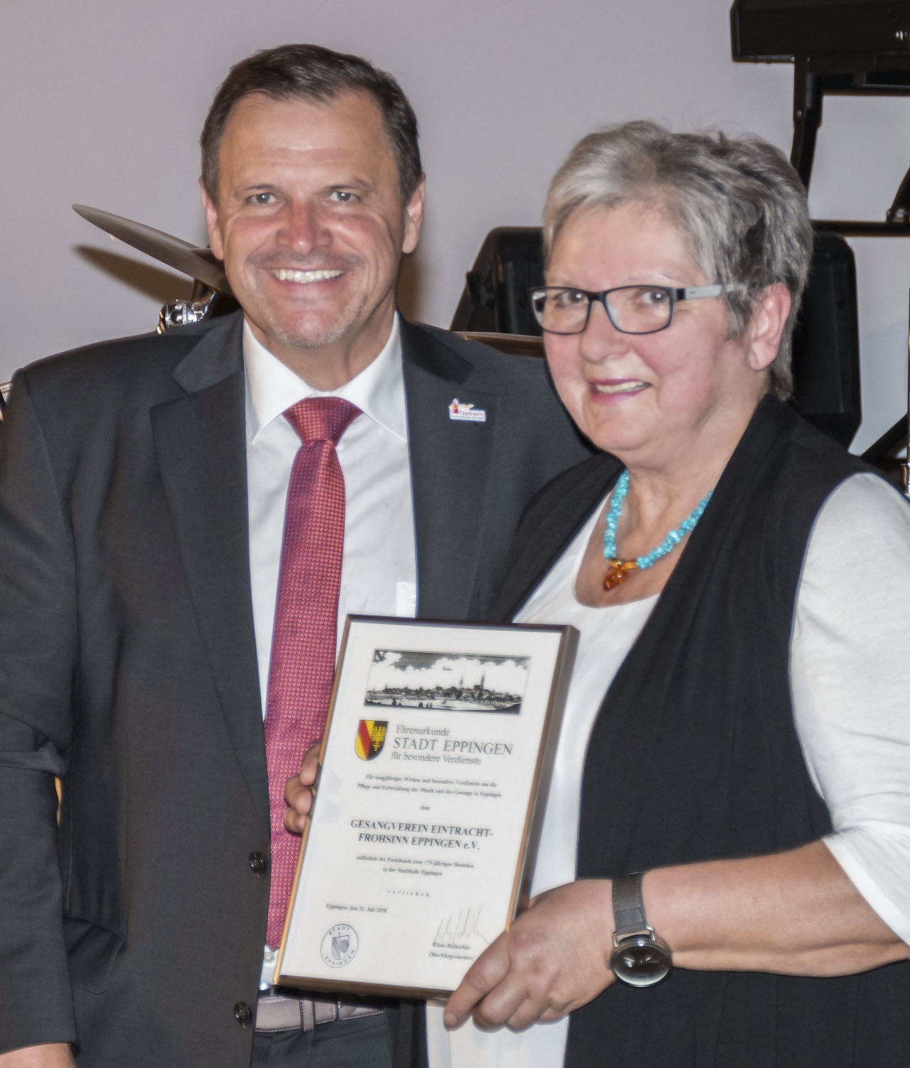 dritte Überraschung. Michael Mireisz, der 1. Vorsitzende des Chorverbands Elsenzgau, würdigte ausführlich das Engagement der Sänger aus der Fachwerkstadt, weil auf deren Betreiben der Verband nach der Gleichschaltung im 3. Reich und dem Kriegsende wieder mit Leben erfüllt wurde und sich etliche Eppinger in der Vorstandschaft engagierten.