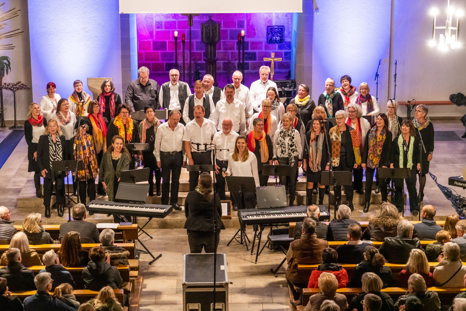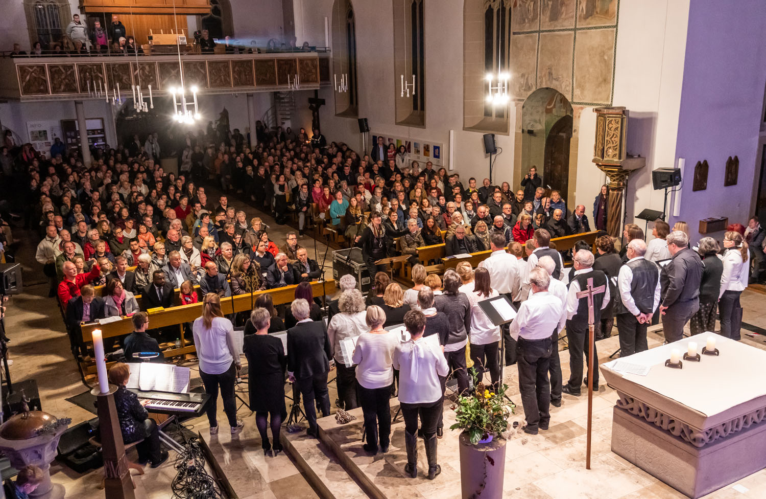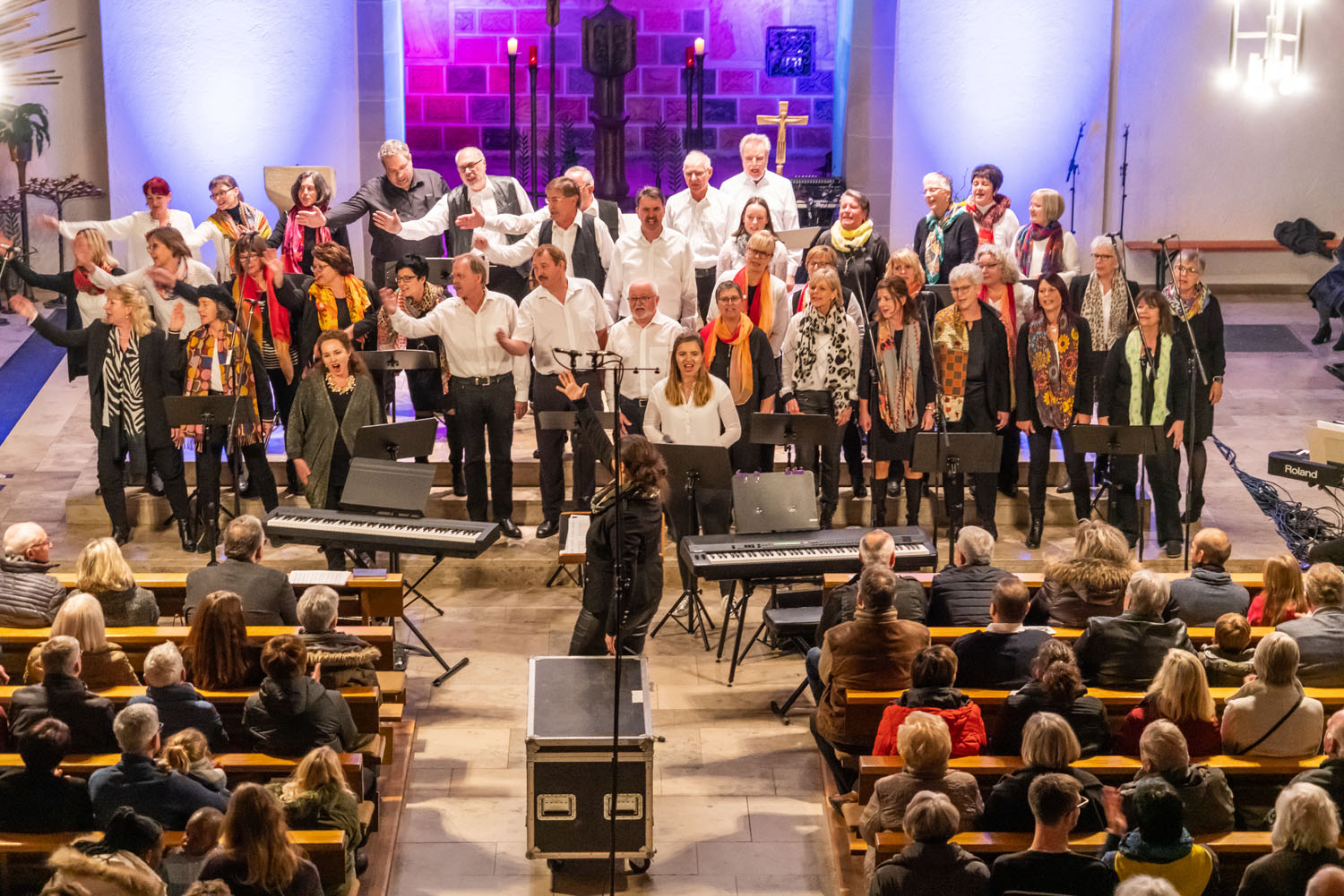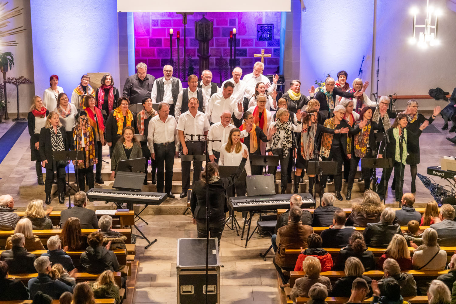 Den Abend eröffneten ganz selbstbewusst die „Rainbow Teens“ aus Elsenz, als sei es etwas ganz Normales, vor einer bis auf den letzten Platz besetzten Kirche zu singen. Der „Kleine Chor“ Adelshofen unter der Leitung von Maren Hettler-Wiedemann überzeugte mit drei bekannteren Gospelsongs. Der „Chor im Takt“ aus Rohrbach trug sogar zwei Titel in deutscher Sprache vor. Eng um den Altar wurde es erstmals, als die Elsenzer Formation „Atemlos“ die Bühne betrat: 39 Sängerinnen und Sänger drängten sich zusammen. Das bedeutete an diesem Abend die Rekordbeteiligung - gemeinsam mit den „Kraichgau Singers“, die genauso viele Akteure aufboten und dabei sogar noch den Ausfall von knapp zehn Sängerinnen und Sängern verkraften mussten. Wie vielfältig das Programm war, bewiesen die Elsenzer, indem sie u.a. „Lean On Me“ anstimmten, ursprünglich ein Popsong aus den 1970er Jahren, der mittlerweile durchaus als Gospel durchgeht. Der Gospelchor „SoundS Of Joy“ aus Bretzfeld bot drei ruhige Stücke dar, wobei viele Besucher der Meinung waren, dass die sehr guten Stimmen von der dynamischen Klavierbegleitung des Dirigenten überlagert und in den Hintergrund gedrängt wurden. Danach traten die „Kraichgau Singers“ auf. Ursprünglich hatten sie leichte Bedenken, gleich nach den „Gospelprofis“ auf die Bühne zu müssen. Die Bedenken waren aber relativ schnell verflogen. Die Eppinger begannen mit dem getragenen Titel „He's Always Close To You“, der sehr gut ankam. Die ersten lautstarken Beifallsbekundungen folgten nach „Halleluja“ von Leonard Cohen, das im Original inhaltlich auf das Alte Testament zurückgeht. Die „KS“ trugen den Songs in einer von ihrer Dirigentin Nelli Holzki arrangierten Fassung vor. Zum Höhepunkt des Abends avancierte der Song „Baba Yetu“, das „Vater Unser“ in der Sprache der ostafrikanischen Swahili. Die Konzertbesucher waren begeistert. Sie trampelten mit den Füßen auf den Boden, stießen Jubelrufe und Beifallsbekundungen aus und sorgten mit ihrem rhythmischen Applaus dafür, dass der Chor diesen fetzigen Song gleich noch ein zweites Mal anstimmen musste. Danach ging es wieder etwas ruhiger in dem Gotteshaus zu. Die Mühlbacher Formation „SingMit“ unter der Leitung von Herbert Kiefer überzeugte mit drei getragenen Gospeln, wobei sie mit Chis Neemuel einen nigerianischen Gastsänger als Solisten verpflichtet hatten. Die angekündigte musikalische Überraschung entpuppte sich als zehnköpfiges Chorübergreifendes Ensemble unter der Leitung von Nelli Holzki, darunter drei Dirigentinnen und ein Dirigent. Mit dem fetzigen „Shackles“ brachten sie das Publikum erneut zum Mitklatschen. Das ruhige „We are not alone“ trugen sie a cappella vor und sorgten mit den darin enthaltenen Sopransoli für Gänsehautfeeling beim Publikum. Als die Chöre zum gemeinsamen großen Finale „Amazing Grace“ anstimmten, reichte der Platz um den Altar für die rund 200 Sängerinnen und Sänger fast nicht aus. Die Besucherinnen und Besucher dankten den Mitwirkenden mit frenetischem Applaus, der erst endete, als die Akteure nochmals die beiden letzten Strophen darboten. Alle Mitwirkenden und das Publikum waren sich einig: "Loud, Pure, Gospel" war eine tolle Veranstaltung und eine Werbung für den Chorgesang!