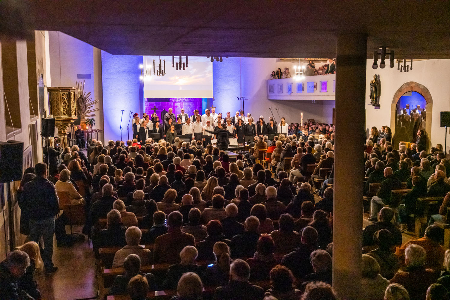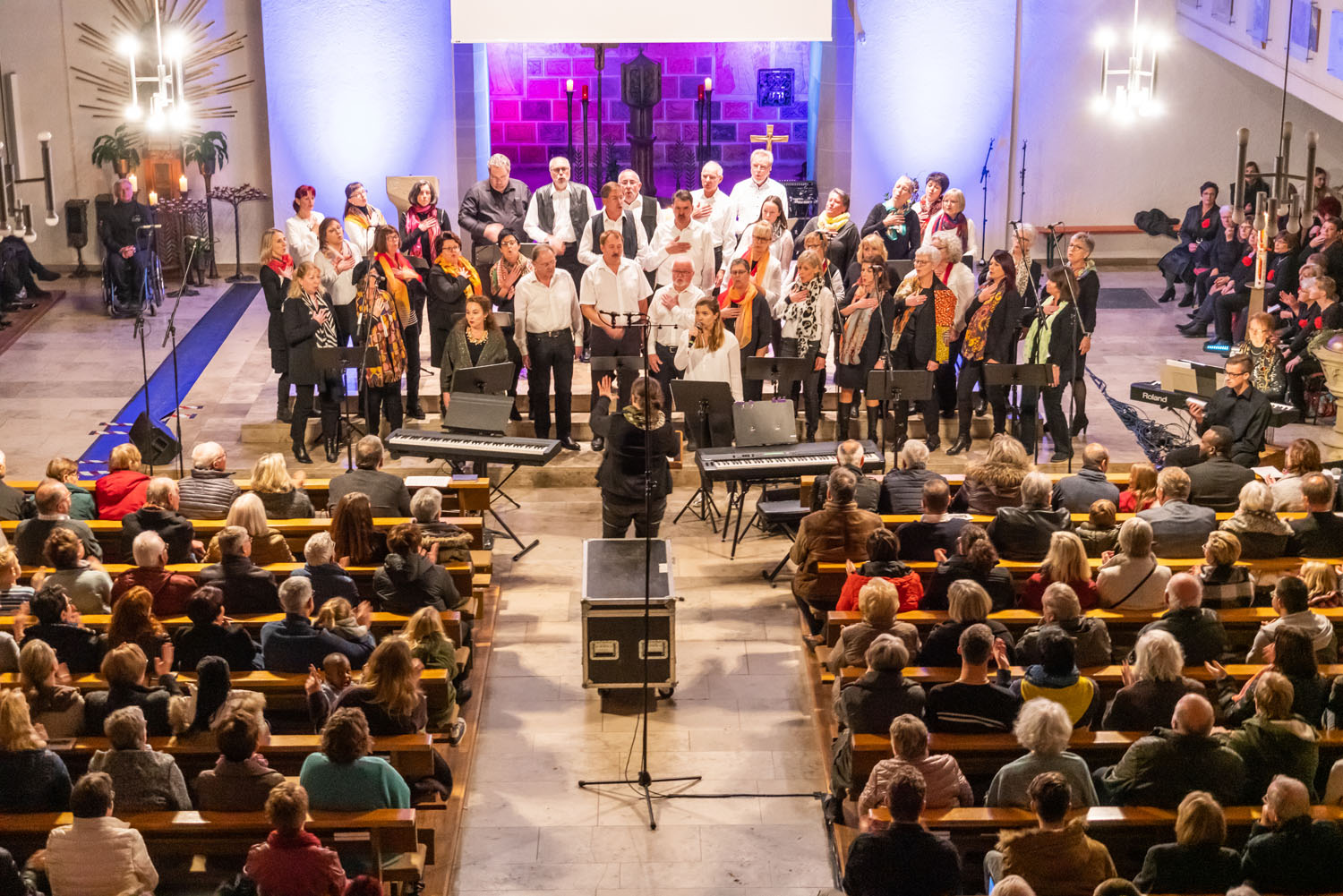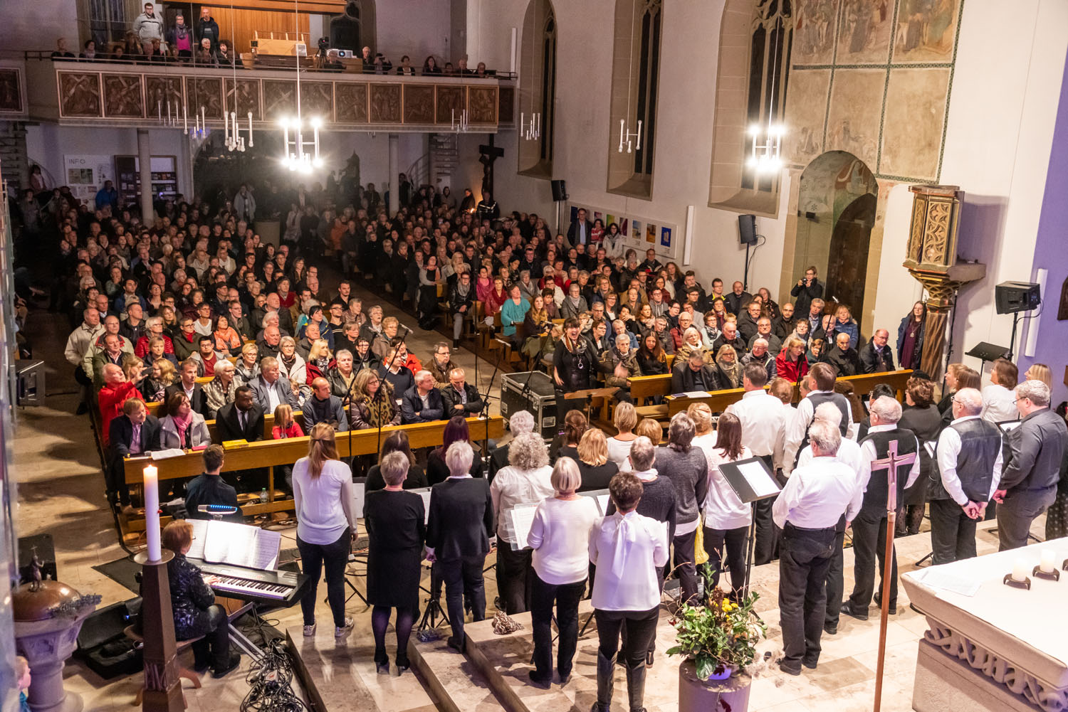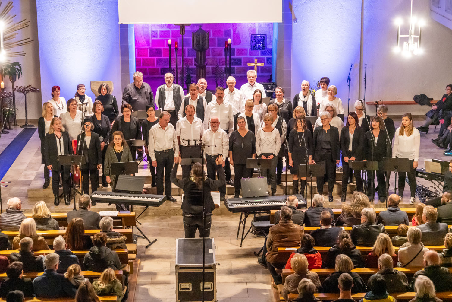 Den Abend eröffneten ganz selbstbewusst die „Rainbow Teens“ aus Elsenz, als sei es etwas ganz Normales, vor einer bis auf den letzten Platz besetzten Kirche zu singen. Der „Kleine Chor“ Adelshofen unter der Leitung von Maren Hettler-Wiedemann überzeugte mit drei bekannteren Gospelsongs. Der „Chor im Takt“ aus Rohrbach trug sogar zwei Titel in deutscher Sprache vor. Eng um den Altar wurde es erstmals, als die Elsenzer Formation „Atemlos“ die Bühne betrat: 39 Sängerinnen und Sänger drängten sich zusammen. Das bedeutete an diesem Abend die Rekordbeteiligung - gemeinsam mit den „Kraichgau Singers“, die genauso viele Akteure aufboten und dabei sogar noch den Ausfall von knapp zehn Sängerinnen und Sängern verkraften mussten. Wie vielfältig das Programm war, bewiesen die Elsenzer, indem sie u.a. „Lean On Me“ anstimmten, ursprünglich ein Popsong aus den 1970er Jahren, der mittlerweile durchaus als Gospel durchgeht. Der Gospelchor „SoundS Of Joy“ aus Bretzfeld bot drei ruhige Stücke dar, wobei viele Besucher der Meinung waren, dass die sehr guten Stimmen von der dynamischen Klavierbegleitung des Dirigenten überlagert und in den Hintergrund gedrängt wurden. Danach traten die „Kraichgau Singers“ auf. Ursprünglich hatten sie leichte Bedenken, gleich nach den „Gospelprofis“ auf die Bühne zu müssen. Die Bedenken waren aber relativ schnell verflogen. Die Eppinger begannen mit dem getragenen Titel „He's Always Close To You“, der sehr gut ankam. Die ersten lautstarken Beifallsbekundungen folgten nach „Halleluja“ von Leonard Cohen, das im Original inhaltlich auf das Alte Testament zurückgeht. Die „KS“ trugen den Songs in einer von ihrer Dirigentin Nelli Holzki arrangierten Fassung vor. Zum Höhepunkt des Abends avancierte der Song „Baba Yetu“, das „Vater Unser“ in der Sprache der ostafrikanischen Swahili. Die Konzertbesucher waren begeistert. Sie trampelten mit den Füßen auf den Boden, stießen Jubelrufe und Beifallsbekundungen aus und sorgten mit ihrem rhythmischen Applaus dafür, dass der Chor diesen fetzigen Song gleich noch ein zweites Mal anstimmen musste. Danach ging es wieder etwas ruhiger in dem Gotteshaus zu. Die Mühlbacher Formation „SingMit“ unter der Leitung von Herbert Kiefer überzeugte mit drei getragenen Gospeln, wobei sie mit Chis Neemuel einen nigerianischen Gastsänger als Solisten verpflichtet hatten. Die angekündigte musikalische Überraschung entpuppte sich als zehnköpfiges Chorübergreifendes Ensemble unter der Leitung von Nelli Holzki, darunter drei Dirigentinnen und ein Dirigent. Mit dem fetzigen „Shackles“ brachten sie das Publikum erneut zum Mitklatschen. Das ruhige „We are not alone“ trugen sie a cappella vor und sorgten mit den darin enthaltenen Sopransoli für Gänsehautfeeling beim Publikum. Als die Chöre zum gemeinsamen großen Finale „Amazing Grace“ anstimmten, reichte der Platz um den Altar für die rund 200 Sängerinnen und Sänger fast nicht aus. Die Besucherinnen und Besucher dankten den Mitwirkenden mit frenetischem Applaus, der erst endete, als die Akteure nochmals die beiden letzten Strophen darboten. Alle Mitwirkenden und das Publikum waren sich einig: "Loud, Pure, Gospel" war eine tolle Veranstaltung und eine Werbung für den Chorgesang!