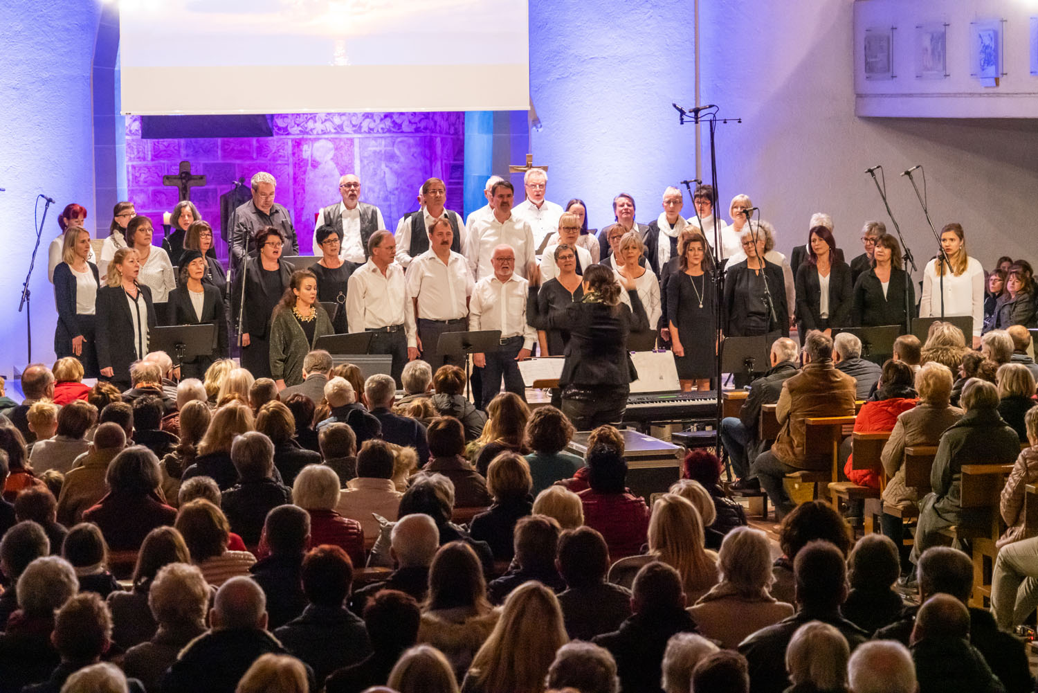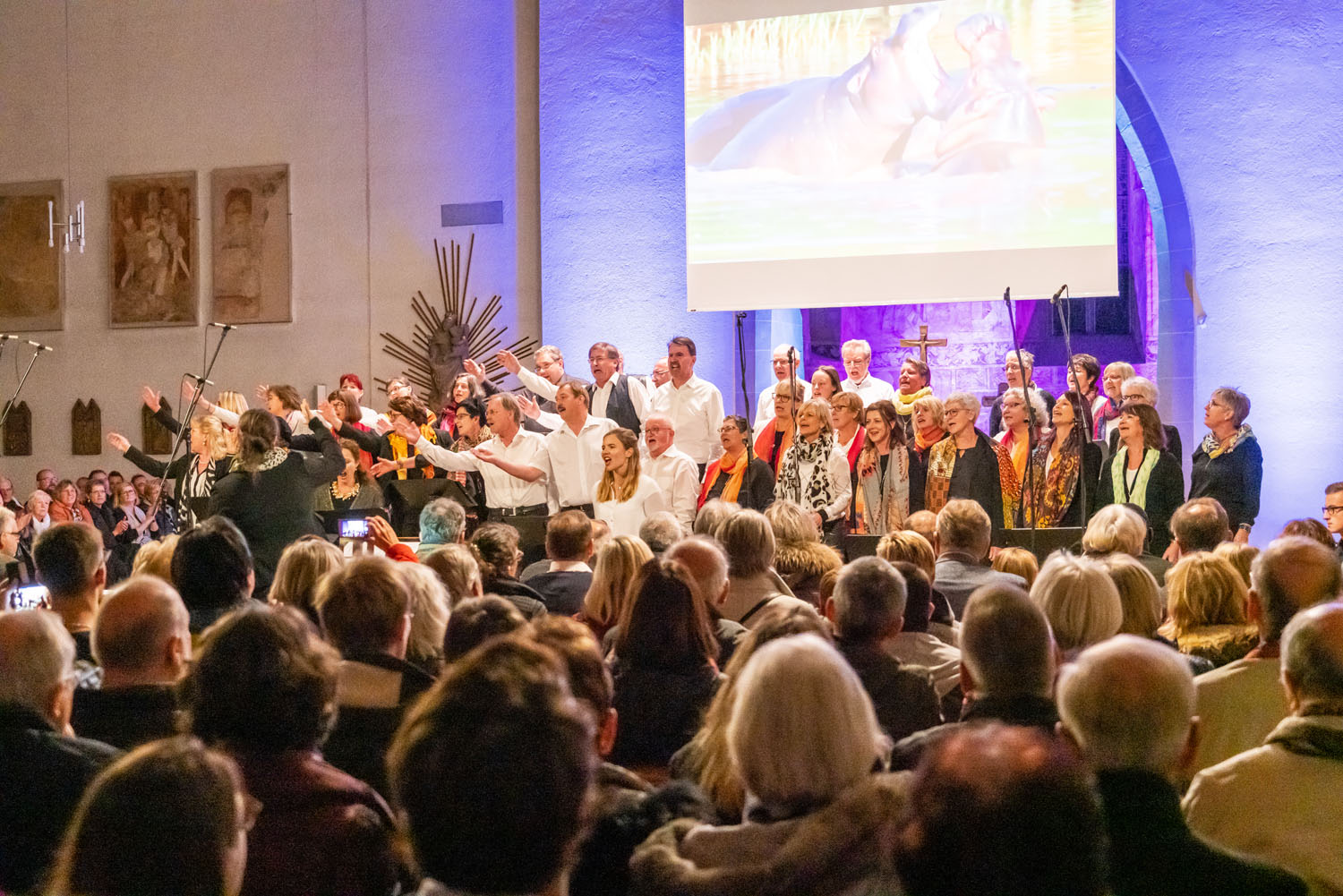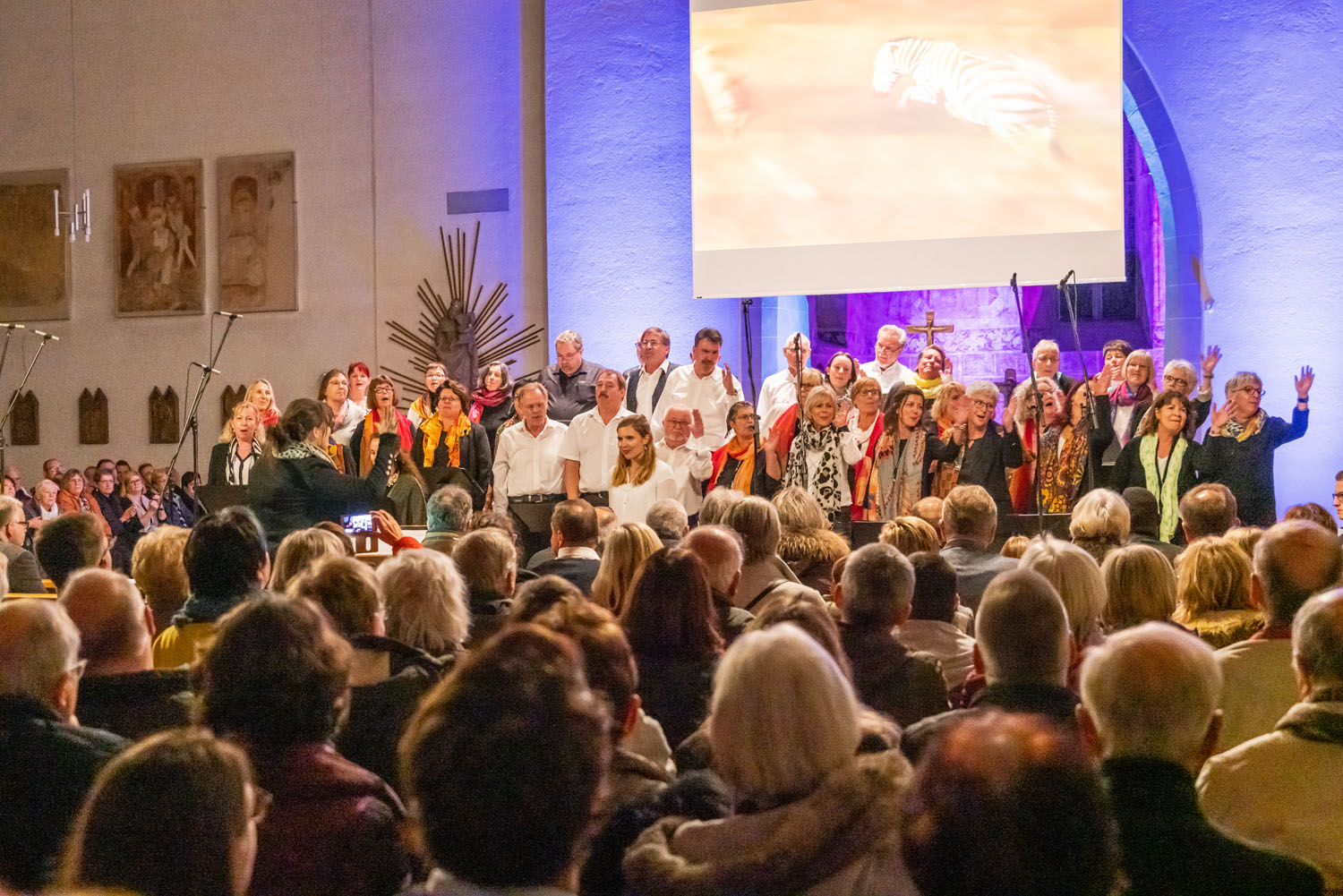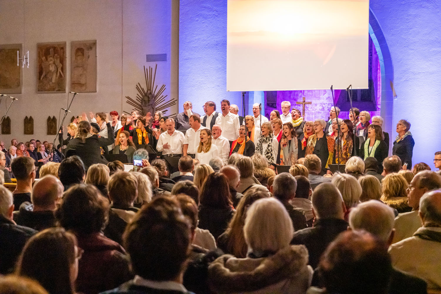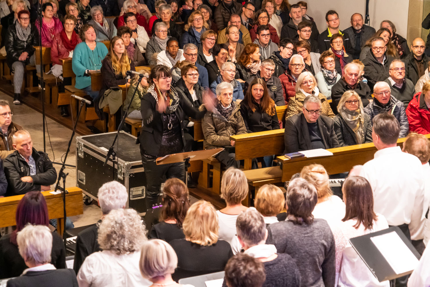 Den Abend eröffneten ganz selbstbewusst die „Rainbow Teens“ aus Elsenz, als sei es etwas ganz Normales, vor einer bis auf den letzten Platz besetzten Kirche zu singen. Der „Kleine Chor“ Adelshofen unter der Leitung von Maren Hettler-Wiedemann überzeugte mit drei bekannteren Gospelsongs. Der „Chor im Takt“ aus Rohrbach trug sogar zwei Titel in deutscher Sprache vor. Eng um den Altar wurde es erstmals, als die Elsenzer Formation „Atemlos“ die Bühne betrat: 39 Sängerinnen und Sänger drängten sich zusammen. Das bedeutete an diesem Abend die Rekordbeteiligung - gemeinsam mit den „Kraichgau Singers“, die genauso viele Akteure aufboten und dabei sogar noch den Ausfall von knapp zehn Sängerinnen und Sängern verkraften mussten. Wie vielfältig das Programm war, bewiesen die Elsenzer, indem sie u.a. „Lean On Me“ anstimmten, ursprünglich ein Popsong aus den 1970er Jahren, der mittlerweile durchaus als Gospel durchgeht. Der Gospelchor „SoundS Of Joy“ aus Bretzfeld bot drei ruhige Stücke dar, wobei viele Besucher der Meinung waren, dass die sehr guten Stimmen von der dynamischen Klavierbegleitung des Dirigenten überlagert und in den Hintergrund gedrängt wurden. Danach traten die „Kraichgau Singers“ auf. Ursprünglich hatten sie leichte Bedenken, gleich nach den „Gospelprofis“ auf die Bühne zu müssen. Die Bedenken waren aber relativ schnell verflogen. Die Eppinger begannen mit dem getragenen Titel „He's Always Close To You“, der sehr gut ankam. Die ersten lautstarken Beifallsbekundungen folgten nach „Halleluja“ von Leonard Cohen, das im Original inhaltlich auf das Alte Testament zurückgeht. Die „KS“ trugen den Songs in einer von ihrer Dirigentin Nelli Holzki arrangierten Fassung vor. Zum Höhepunkt des Abends avancierte der Song „Baba Yetu“, das „Vater Unser“ in der Sprache der ostafrikanischen Swahili. Die Konzertbesucher waren begeistert. Sie trampelten mit den Füßen auf den Boden, stießen Jubelrufe und Beifallsbekundungen aus und sorgten mit ihrem rhythmischen Applaus dafür, dass der Chor diesen fetzigen Song gleich noch ein zweites Mal anstimmen musste. Danach ging es wieder etwas ruhiger in dem Gotteshaus zu. Die Mühlbacher Formation „SingMit“ unter der Leitung von Herbert Kiefer überzeugte mit drei getragenen Gospeln, wobei sie mit Chis Neemuel einen nigerianischen Gastsänger als Solisten verpflichtet hatten. Die angekündigte musikalische Überraschung entpuppte sich als zehnköpfiges Chorübergreifendes Ensemble unter der Leitung von Nelli Holzki, darunter drei Dirigentinnen und ein Dirigent. Mit dem fetzigen „Shackles“ brachten sie das Publikum erneut zum Mitklatschen. Das ruhige „We are not alone“ trugen sie a cappella vor und sorgten mit den darin enthaltenen Sopransoli für Gänsehautfeeling beim Publikum. Als die Chöre zum gemeinsamen großen Finale „Amazing Grace“ anstimmten, reichte der Platz um den Altar für die rund 200 Sängerinnen und Sänger fast nicht aus. Die Besucherinnen und Besucher dankten den Mitwirkenden mit frenetischem Applaus, der erst endete, als die Akteure nochmals die beiden letzten Strophen darboten. Alle Mitwirkenden und das Publikum waren sich einig: "Loud, Pure, Gospel" war eine tolle Veranstaltung und eine Werbung für den Chorgesang!
