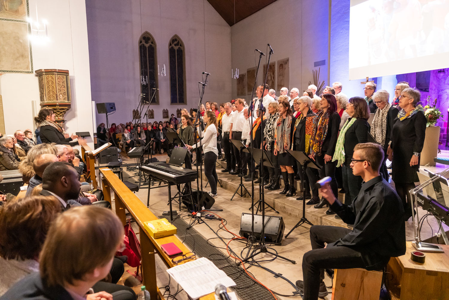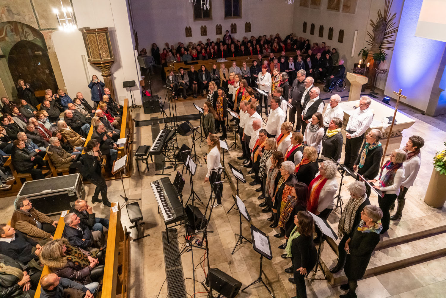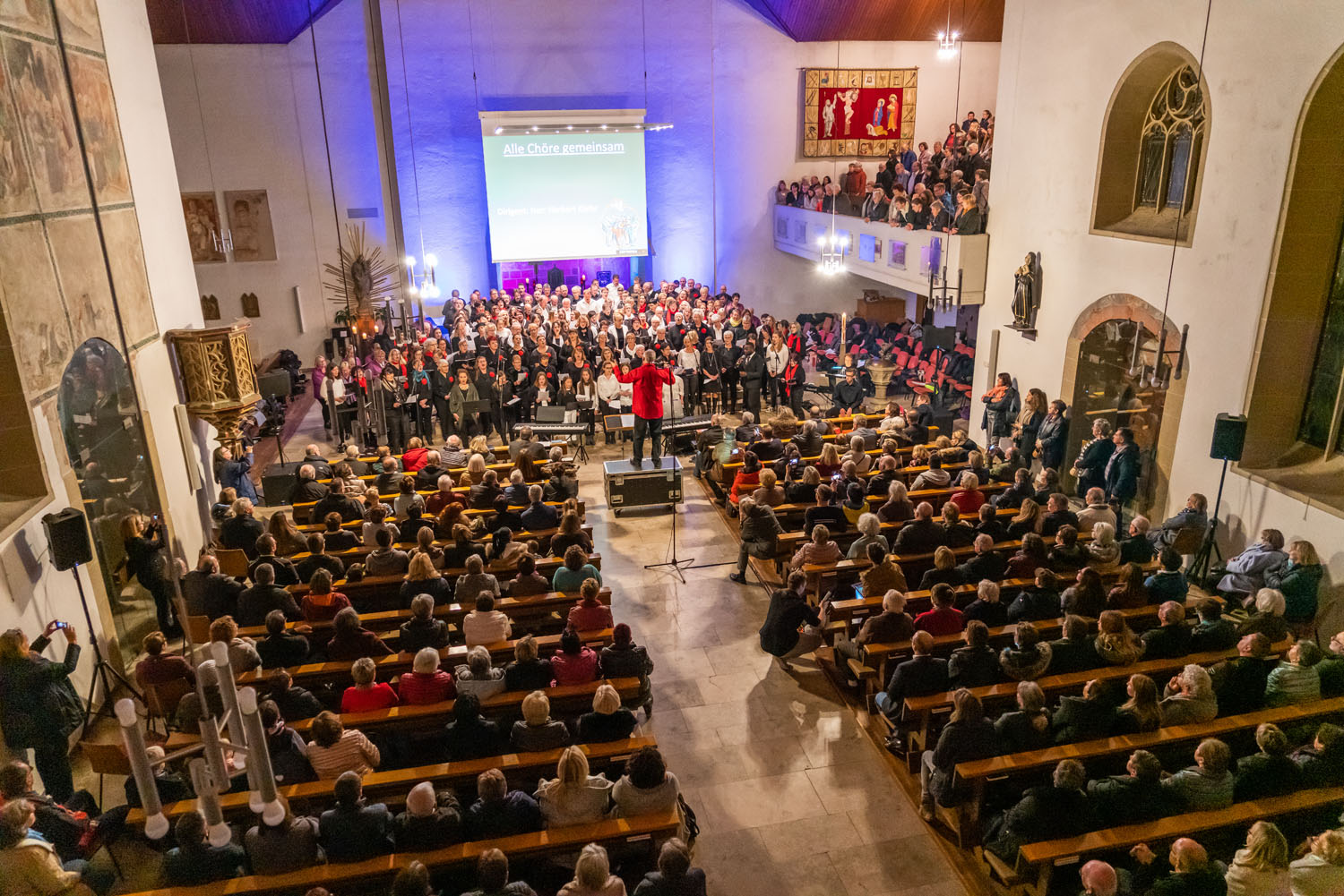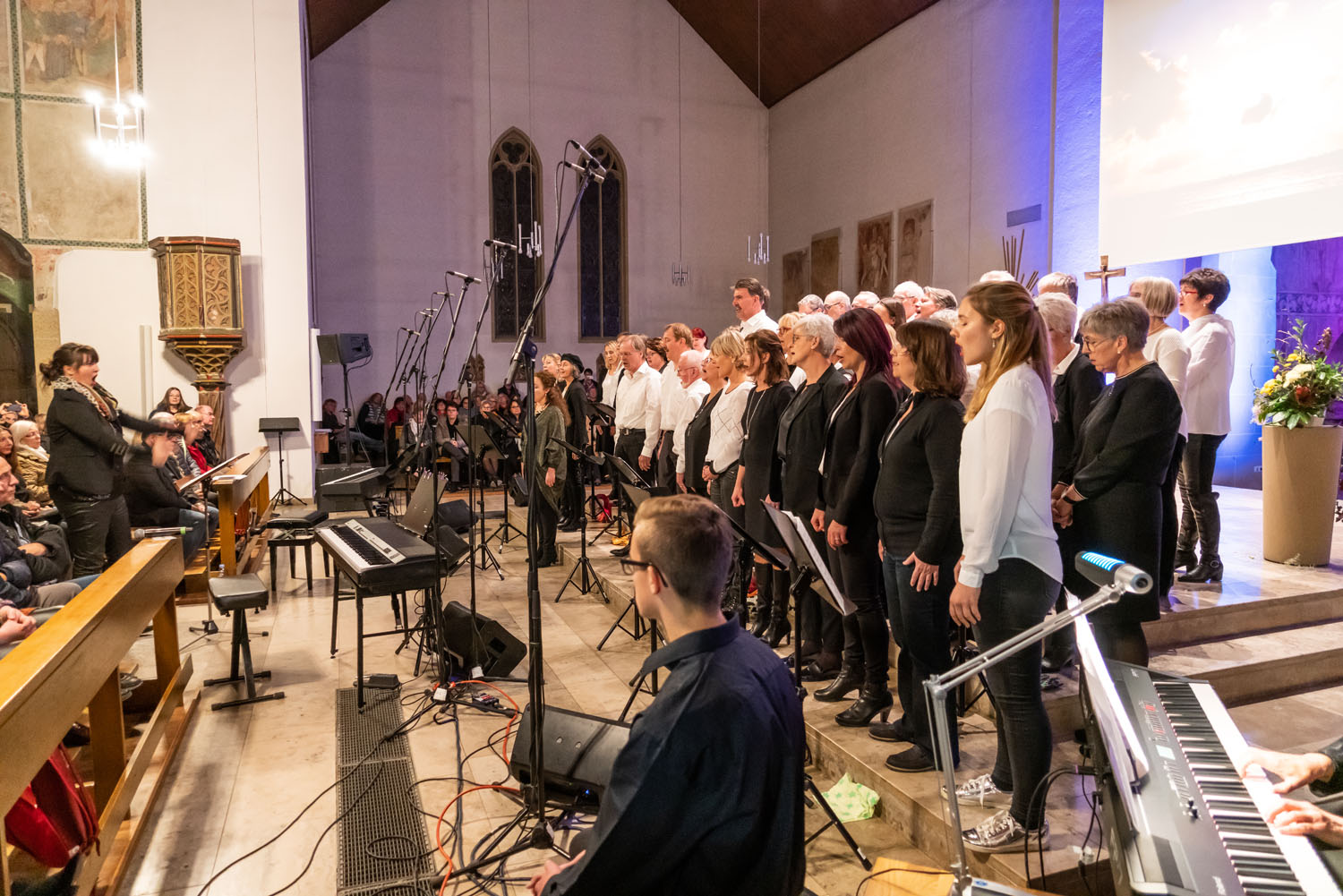 Den Abend eröffneten ganz selbstbewusst die „Rainbow Teens“ aus Elsenz, als sei es etwas ganz Normales, vor einer bis auf den letzten Platz besetzten Kirche zu singen. Der „Kleine Chor“ Adelshofen unter der Leitung von Maren Hettler-Wiedemann überzeugte mit drei bekannteren Gospelsongs. Der „Chor im Takt“ aus Rohrbach trug sogar zwei Titel in deutscher Sprache vor. Eng um den Altar wurde es erstmals, als die Elsenzer Formation „Atemlos“ die Bühne betrat: 39 Sängerinnen und Sänger drängten sich zusammen. Das bedeutete an diesem Abend die Rekordbeteiligung - gemeinsam mit den „Kraichgau Singers“, die genauso viele Akteure aufboten und dabei sogar noch den Ausfall von knapp zehn Sängerinnen und Sängern verkraften mussten. Wie vielfältig das Programm war, bewiesen die Elsenzer, indem sie u.a. „Lean On Me“ anstimmten, ursprünglich ein Popsong aus den 1970er Jahren, der mittlerweile durchaus als Gospel durchgeht. Der Gospelchor „SoundS Of Joy“ aus Bretzfeld bot drei ruhige Stücke dar, wobei viele Besucher der Meinung waren, dass die sehr guten Stimmen von der dynamischen Klavierbegleitung des Dirigenten überlagert und in den Hintergrund gedrängt wurden. Danach traten die „Kraichgau Singers“ auf. Ursprünglich hatten sie leichte Bedenken, gleich nach den „Gospelprofis“ auf die Bühne zu müssen. Die Bedenken waren aber relativ schnell verflogen. Die Eppinger begannen mit dem getragenen Titel „He's Always Close To You“, der sehr gut ankam. Die ersten lautstarken Beifallsbekundungen folgten nach „Halleluja“ von Leonard Cohen, das im Original inhaltlich auf das Alte Testament zurückgeht. Die „KS“ trugen den Songs in einer von ihrer Dirigentin Nelli Holzki arrangierten Fassung vor. Zum Höhepunkt des Abends avancierte der Song „Baba Yetu“, das „Vater Unser“ in der Sprache der ostafrikanischen Swahili. Die Konzertbesucher waren begeistert. Sie trampelten mit den Füßen auf den Boden, stießen Jubelrufe und Beifallsbekundungen aus und sorgten mit ihrem rhythmischen Applaus dafür, dass der Chor diesen fetzigen Song gleich noch ein zweites Mal anstimmen musste. Danach ging es wieder etwas ruhiger in dem Gotteshaus zu. Die Mühlbacher Formation „SingMit“ unter der Leitung von Herbert Kiefer überzeugte mit drei getragenen Gospeln, wobei sie mit Chis Neemuel einen nigerianischen Gastsänger als Solisten verpflichtet hatten. Die angekündigte musikalische Überraschung entpuppte sich als zehnköpfiges Chorübergreifendes Ensemble unter der Leitung von Nelli Holzki, darunter drei Dirigentinnen und ein Dirigent. Mit dem fetzigen „Shackles“ brachten sie das Publikum erneut zum Mitklatschen. Das ruhige „We are not alone“ trugen sie a cappella vor und sorgten mit den darin enthaltenen Sopransoli für Gänsehautfeeling beim Publikum. Als die Chöre zum gemeinsamen großen Finale „Amazing Grace“ anstimmten, reichte der Platz um den Altar für die rund 200 Sängerinnen und Sänger fast nicht aus. Die Besucherinnen und Besucher dankten den Mitwirkenden mit frenetischem Applaus, der erst endete, als die Akteure nochmals die beiden letzten Strophen darboten. Alle Mitwirkenden und das Publikum waren sich einig: "Loud, Pure, Gospel" war eine tolle Veranstaltung und eine Werbung für den Chorgesang!