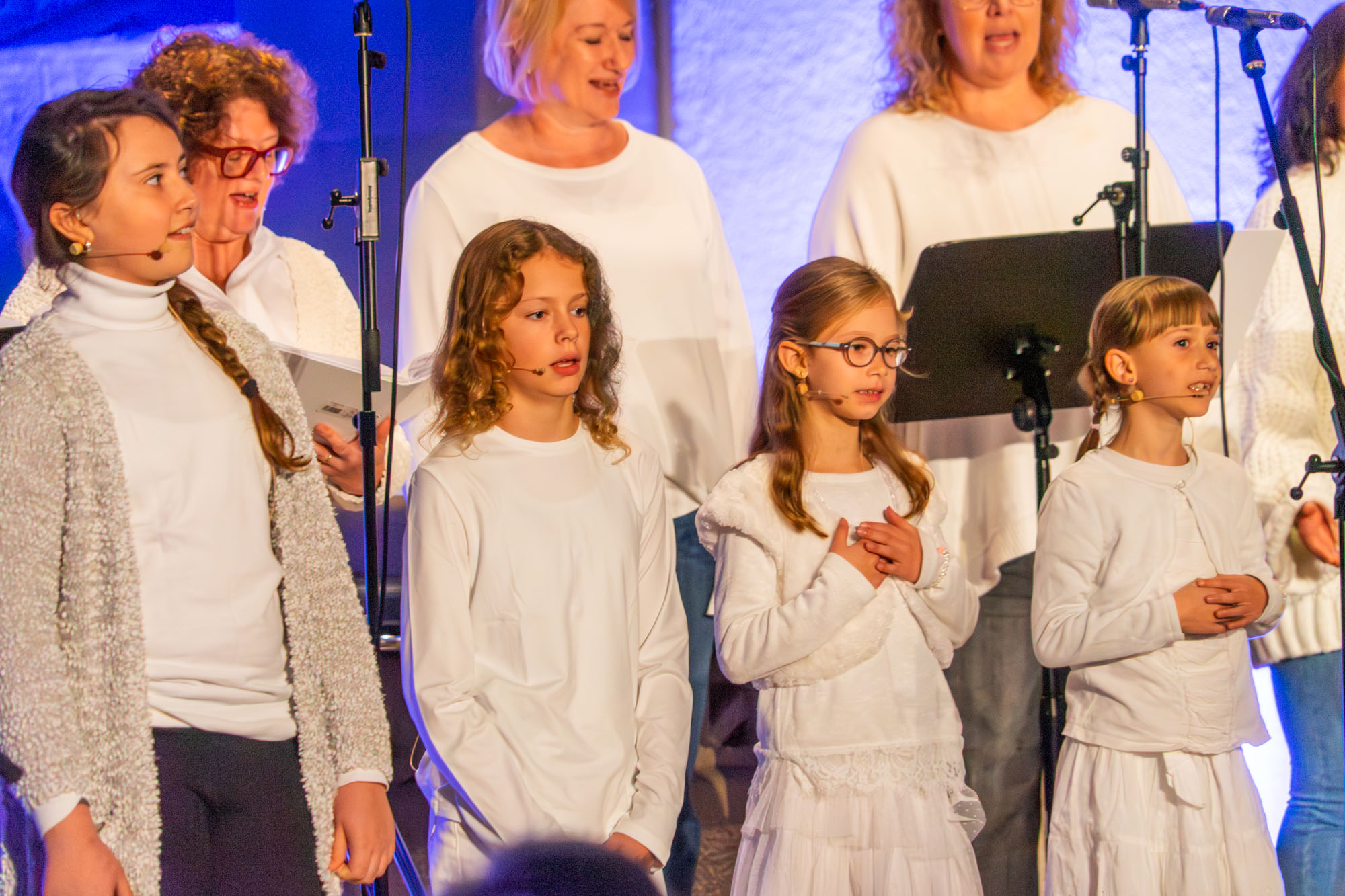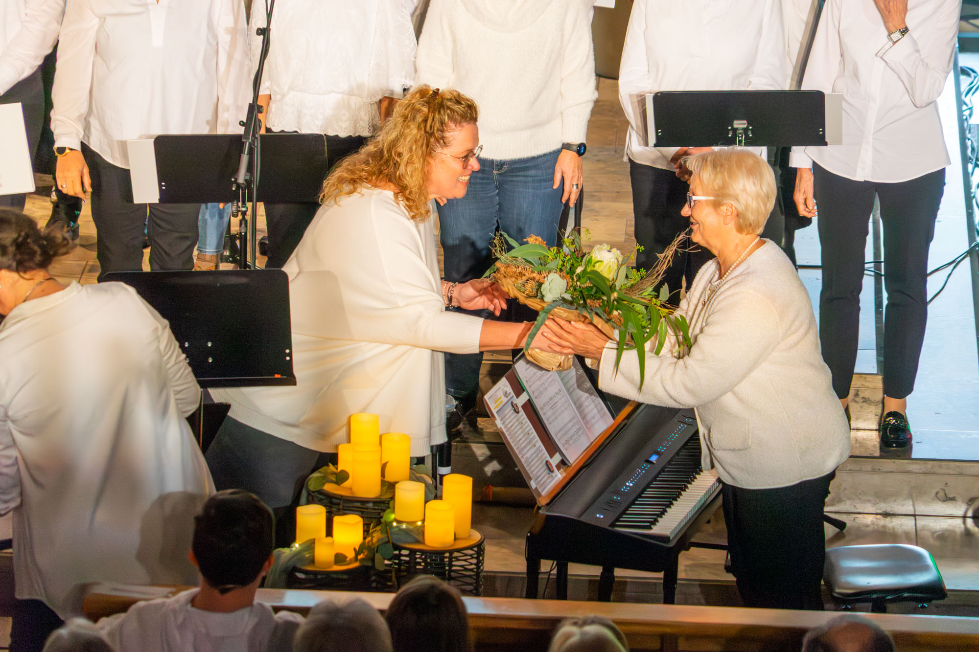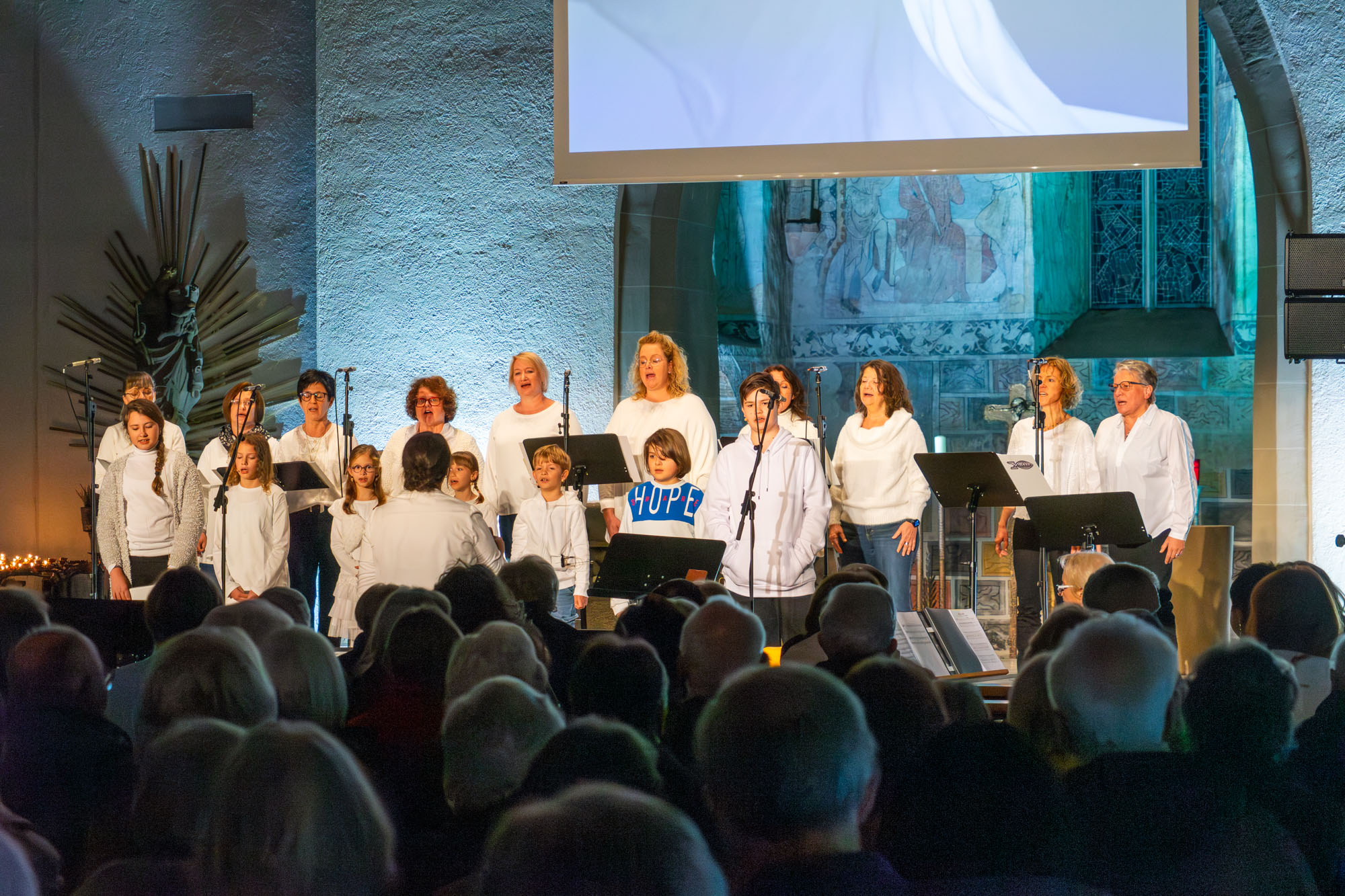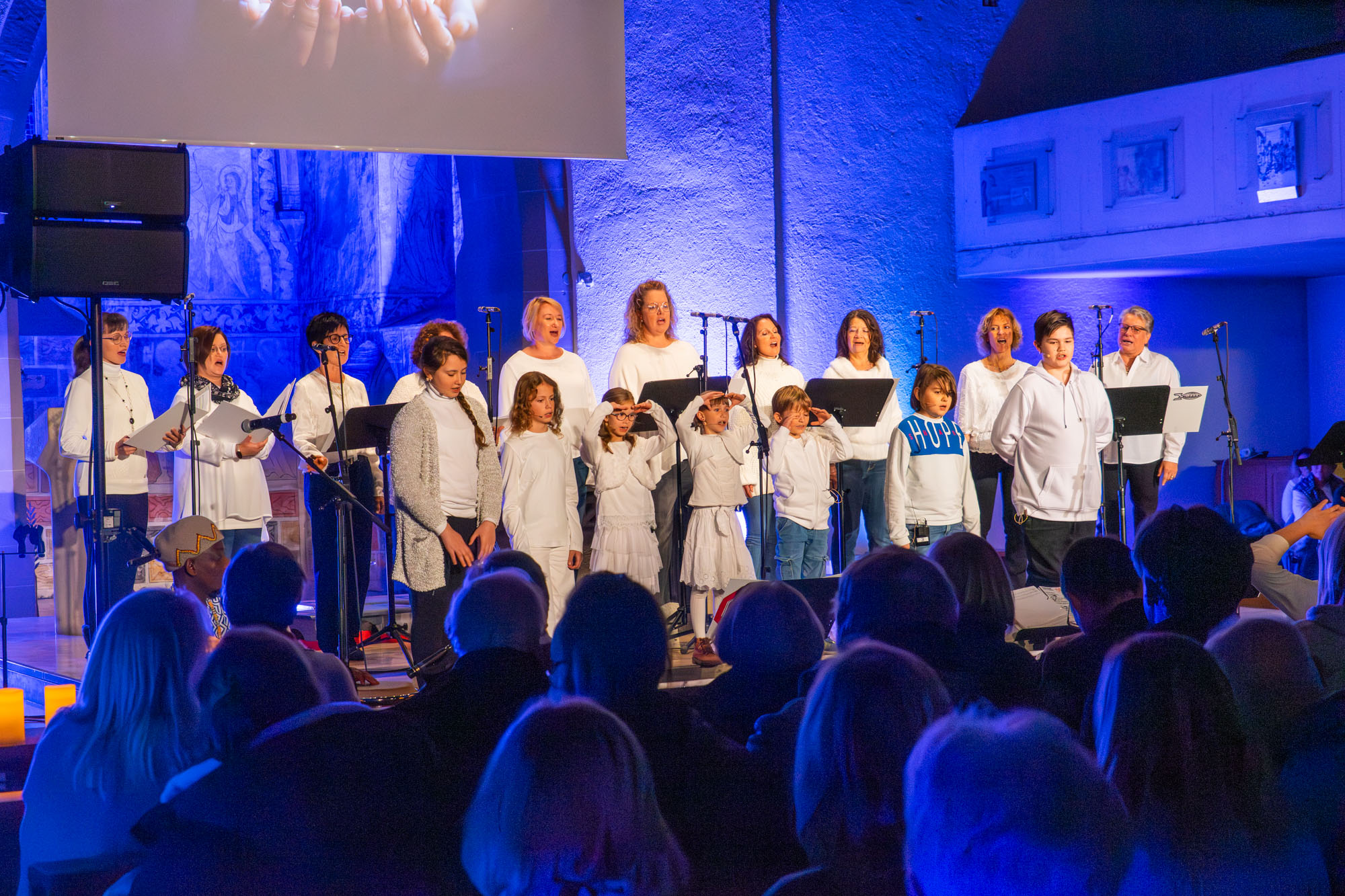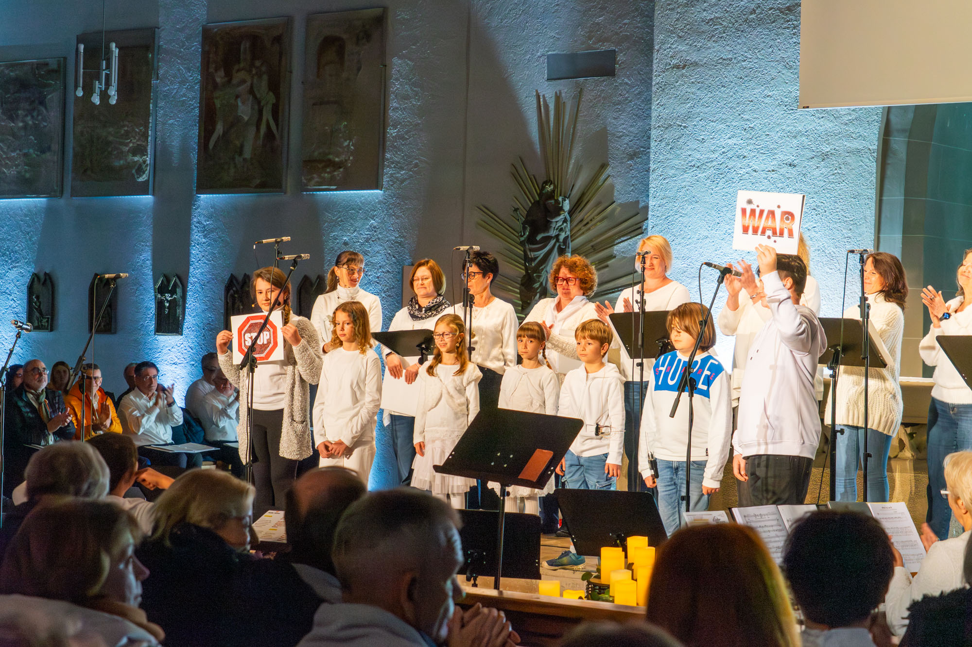 Dann bewiesen die acht Sänger von „Only Men“, dass sie nicht nur Popsongs wie „Wonderful World“ oder „Lonesome Road“ beherrschen, sondern auch klassische Männerchorsätze beeindruckend vortragen können wie „Frieden“ und „Abschied vom Walde“. Anschließend sangen die elf Ladies von „Burn“ den Billy-Joel-Titel „And So It Goes“, der auf eine schottische Ballade zurückgeht, sowie „Gabriellas Song“, bevor sich die acht „KidZ 4 Peace“ zu ihnen gesellten. Gemeinsam stimmten sie Michael Jacksons Riesenhit „Heal The World“ an sowie den weniger bekannten Protestsong „Weiße Fahnen“. Manche Anwesende werteten diesen Auftritt als nächsten Programmhöhepunkt. Und es war in der Tat beeindruckend, wie unbekümmert und selbstsicher sich die Mädchen und Jungs präsentierten – trotz der sicherlich ungewohnten Headsets und in Anbetracht der gut gefüllten Kirchenbänke.