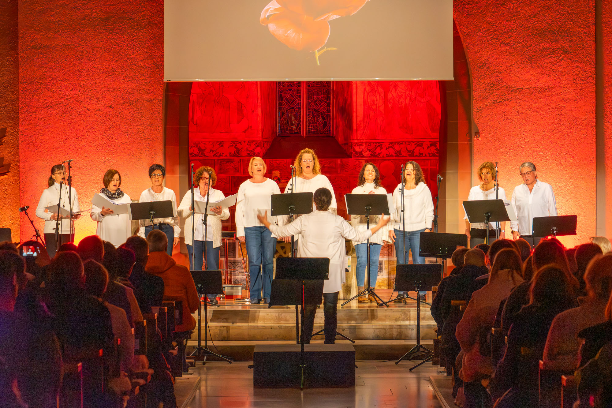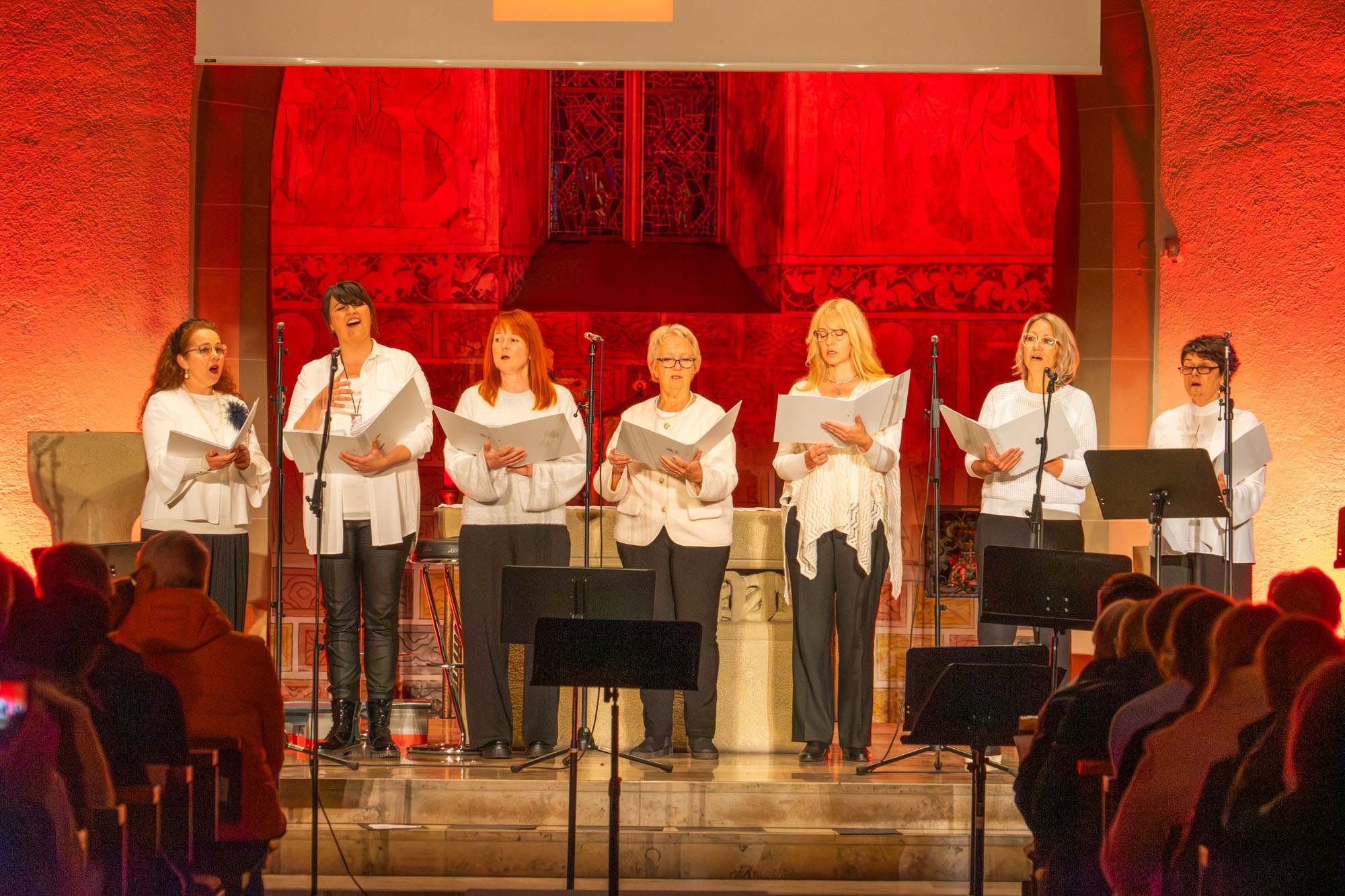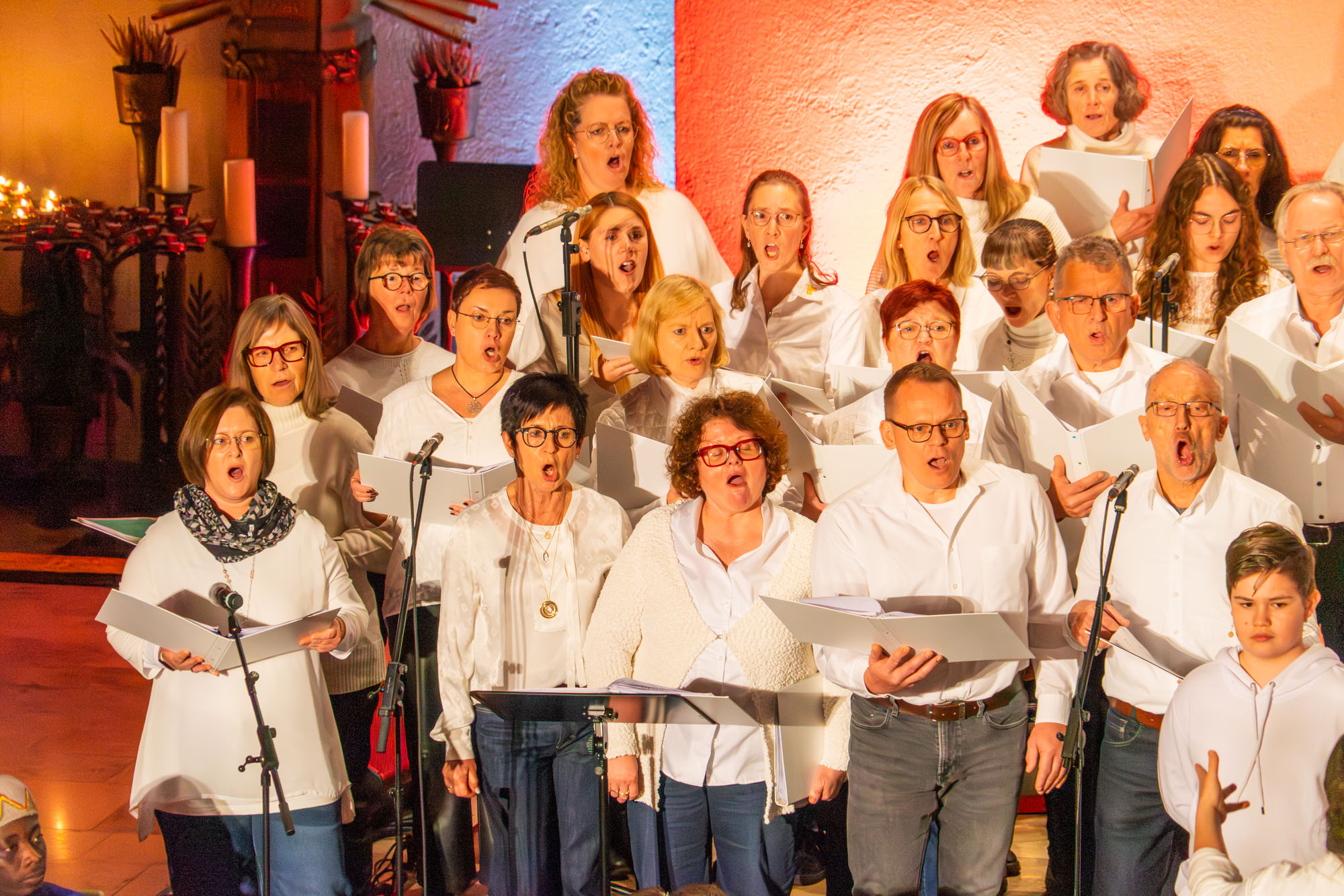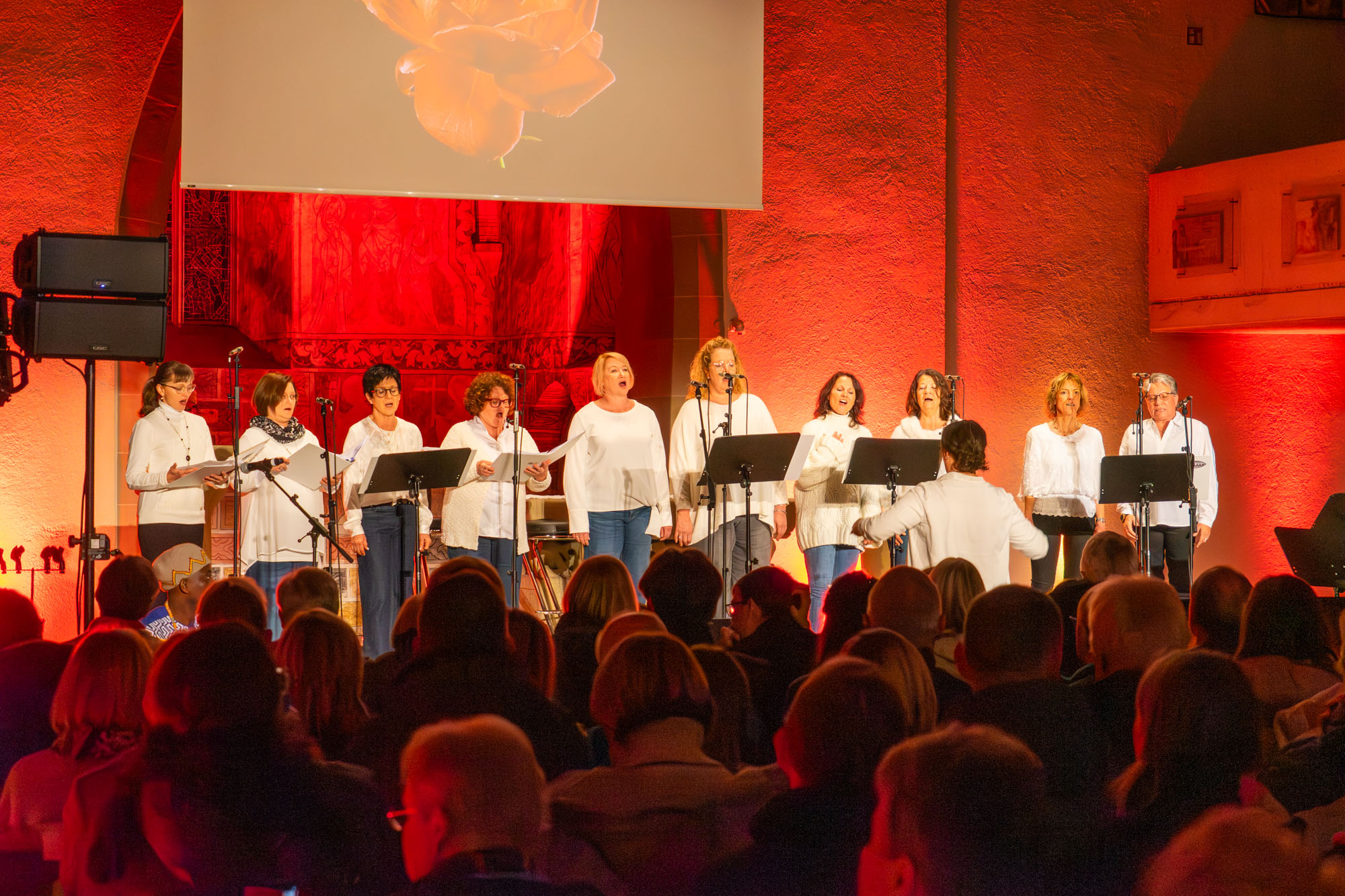 Dann bewiesen die acht Sänger von „Only Men“, dass sie nicht nur Popsongs wie „Wonderful World“ oder „Lonesome Road“ beherrschen, sondern auch klassische Männerchorsätze beeindruckend vortragen können wie „Frieden“ und „Abschied vom Walde“. Anschließend sangen die elf Ladies von „Burn“ den Billy-Joel-Titel „And So It Goes“, der auf eine schottische Ballade zurückgeht, sowie „Gabriellas Song“, bevor sich die acht „KidZ 4 Peace“ zu ihnen gesellten. Gemeinsam stimmten sie Michael Jacksons Riesenhit „Heal The World“ an sowie den weniger bekannten Protestsong „Weiße Fahnen“. Manche Anwesende werteten diesen Auftritt als nächsten Programmhöhepunkt. Und es war in der Tat beeindruckend, wie unbekümmert und selbstsicher sich die Mädchen und Jungs präsentierten – trotz der sicherlich ungewohnten Headsets und in Anbetracht der gut gefüllten Kirchenbänke.