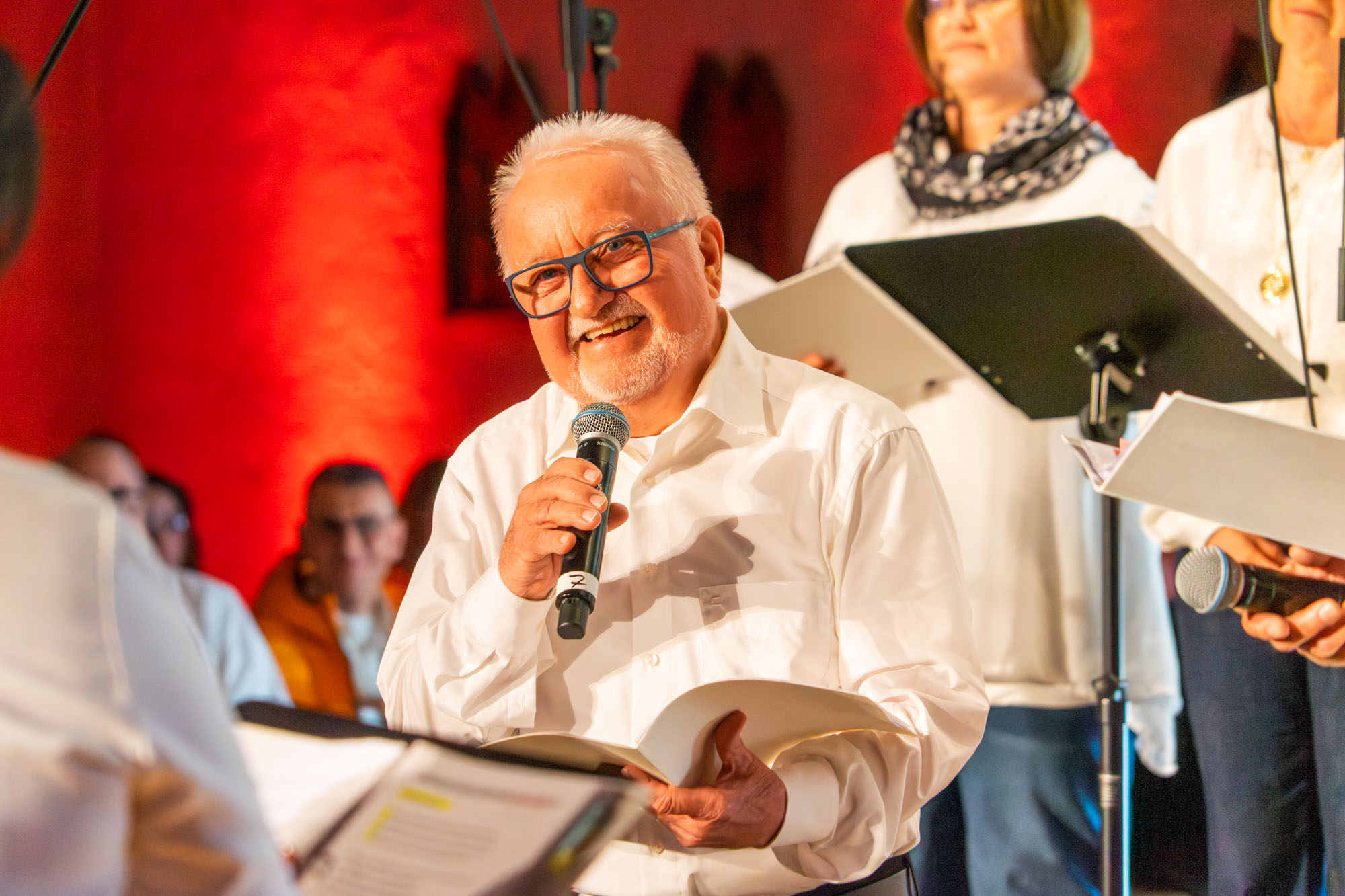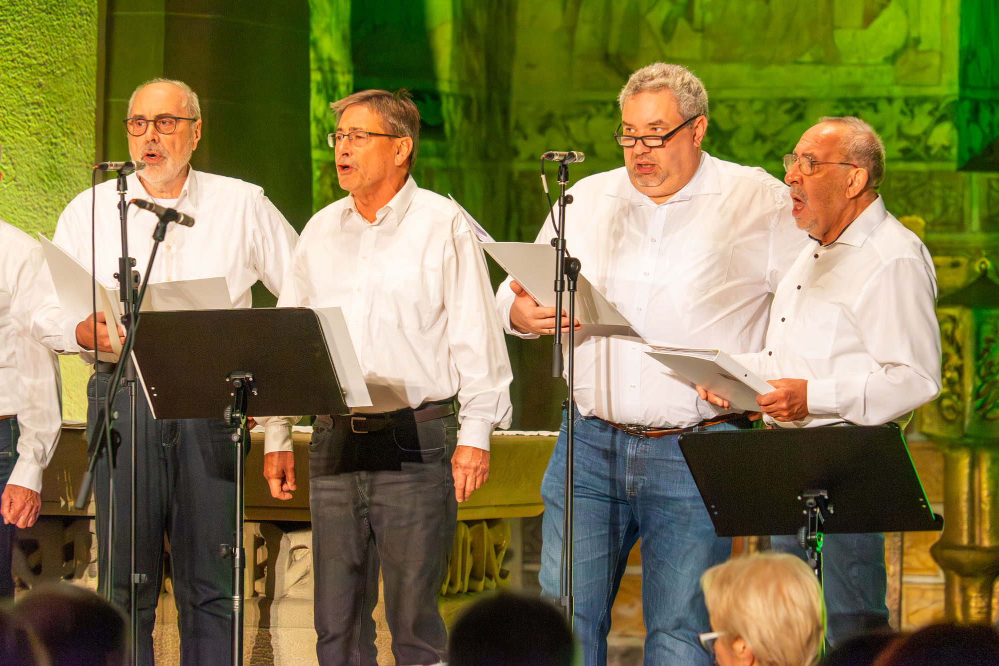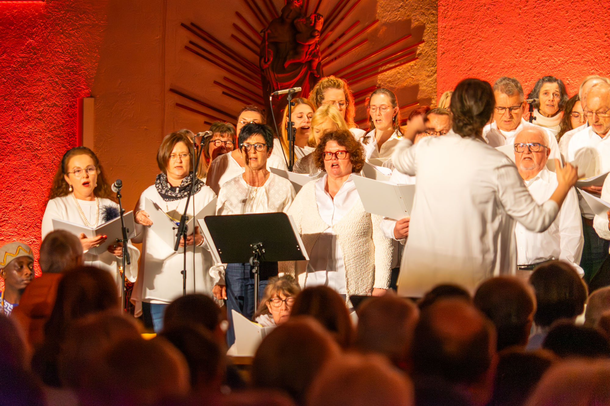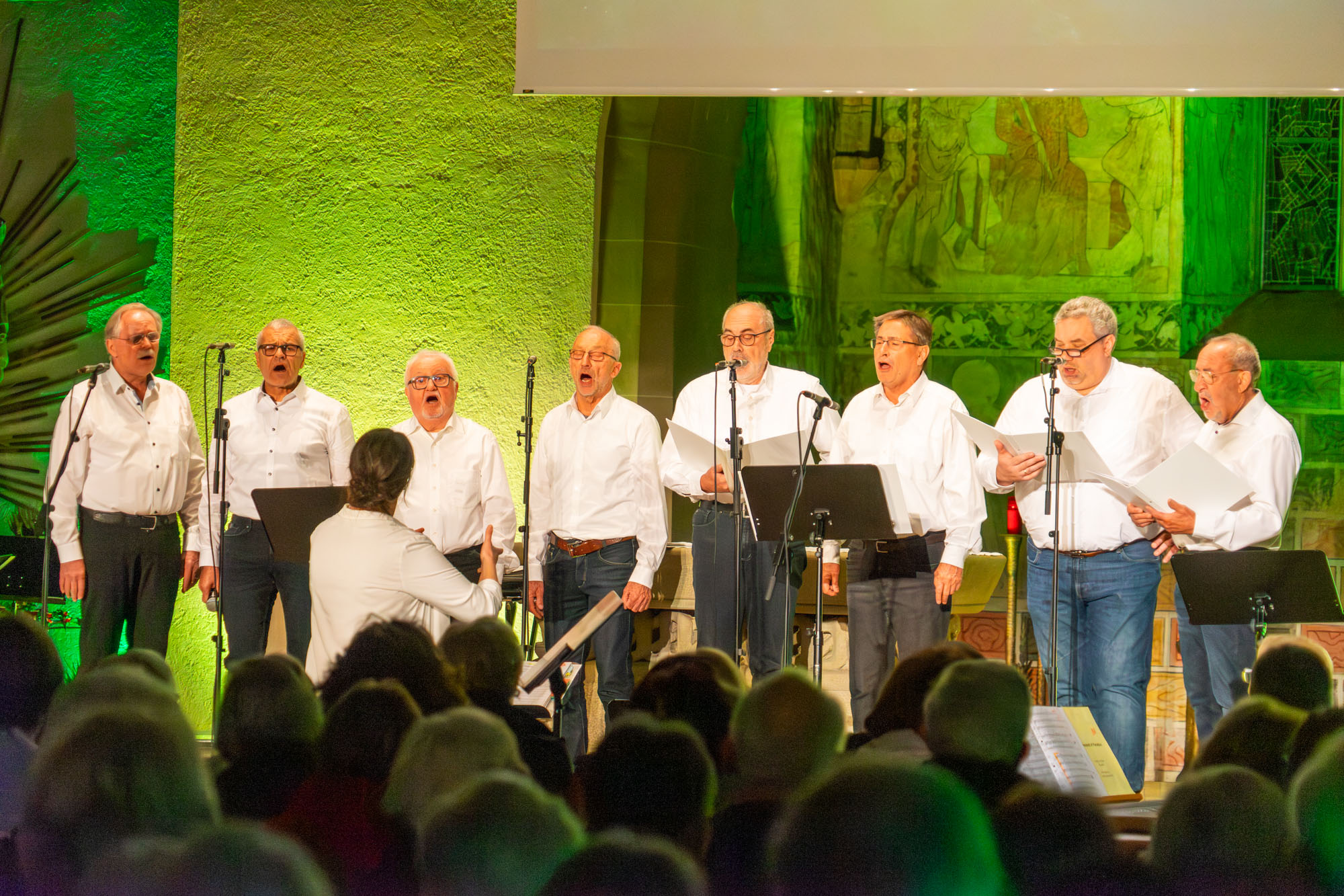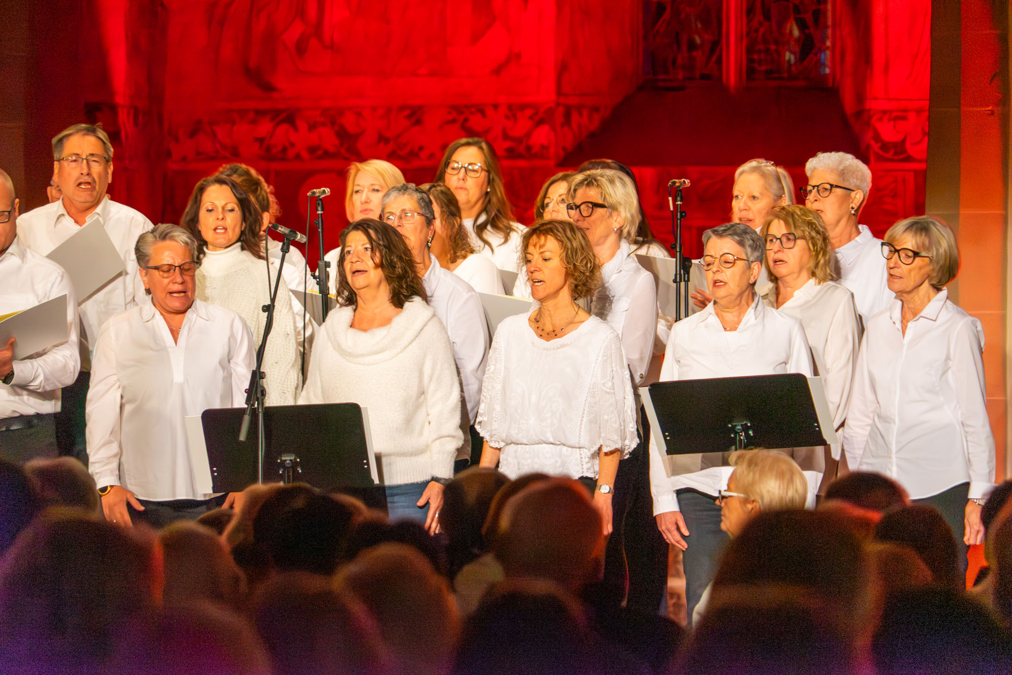 Dann bewiesen die acht Sänger von „Only Men“, dass sie nicht nur Popsongs wie „Wonderful World“ oder „Lonesome Road“ beherrschen, sondern auch klassische Männerchorsätze beeindruckend vortragen können wie „Frieden“ und „Abschied vom Walde“. Anschließend sangen die elf Ladies von „Burn“ den Billy-Joel-Titel „And So It Goes“, der auf eine schottische Ballade zurückgeht, sowie „Gabriellas Song“, bevor sich die acht „KidZ 4 Peace“ zu ihnen gesellten. Gemeinsam stimmten sie Michael Jacksons Riesenhit „Heal The World“ an sowie den weniger bekannten Protestsong „Weiße Fahnen“. Manche Anwesende werteten diesen Auftritt als nächsten Programmhöhepunkt. Und es war in der Tat beeindruckend, wie unbekümmert und selbstsicher sich die Mädchen und Jungs präsentierten – trotz der sicherlich ungewohnten Headsets und in Anbetracht der gut gefüllten Kirchenbänke.