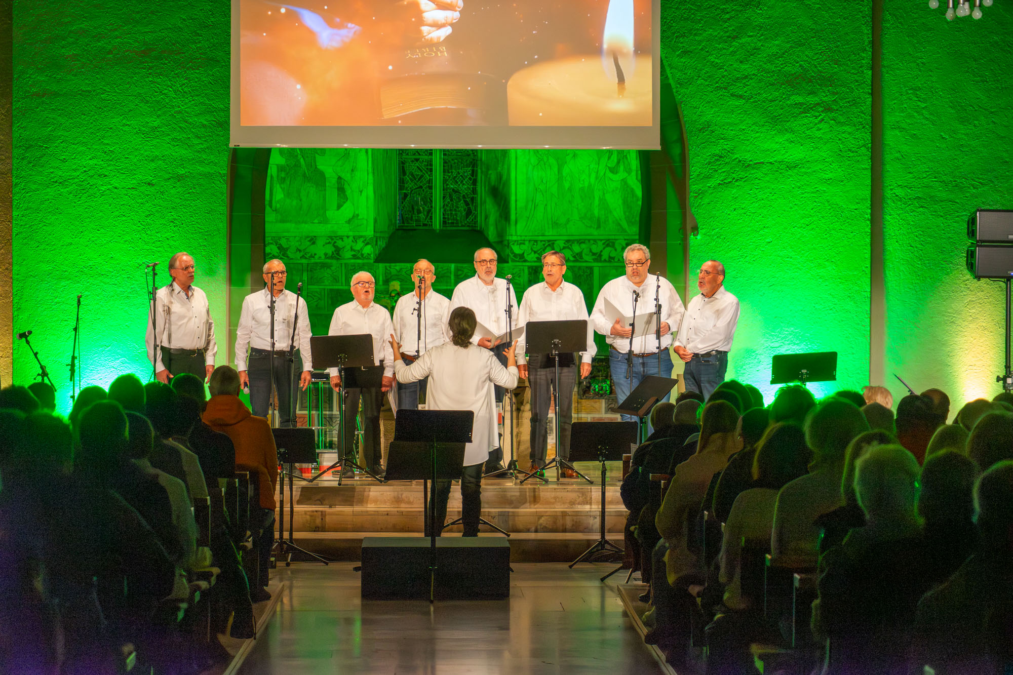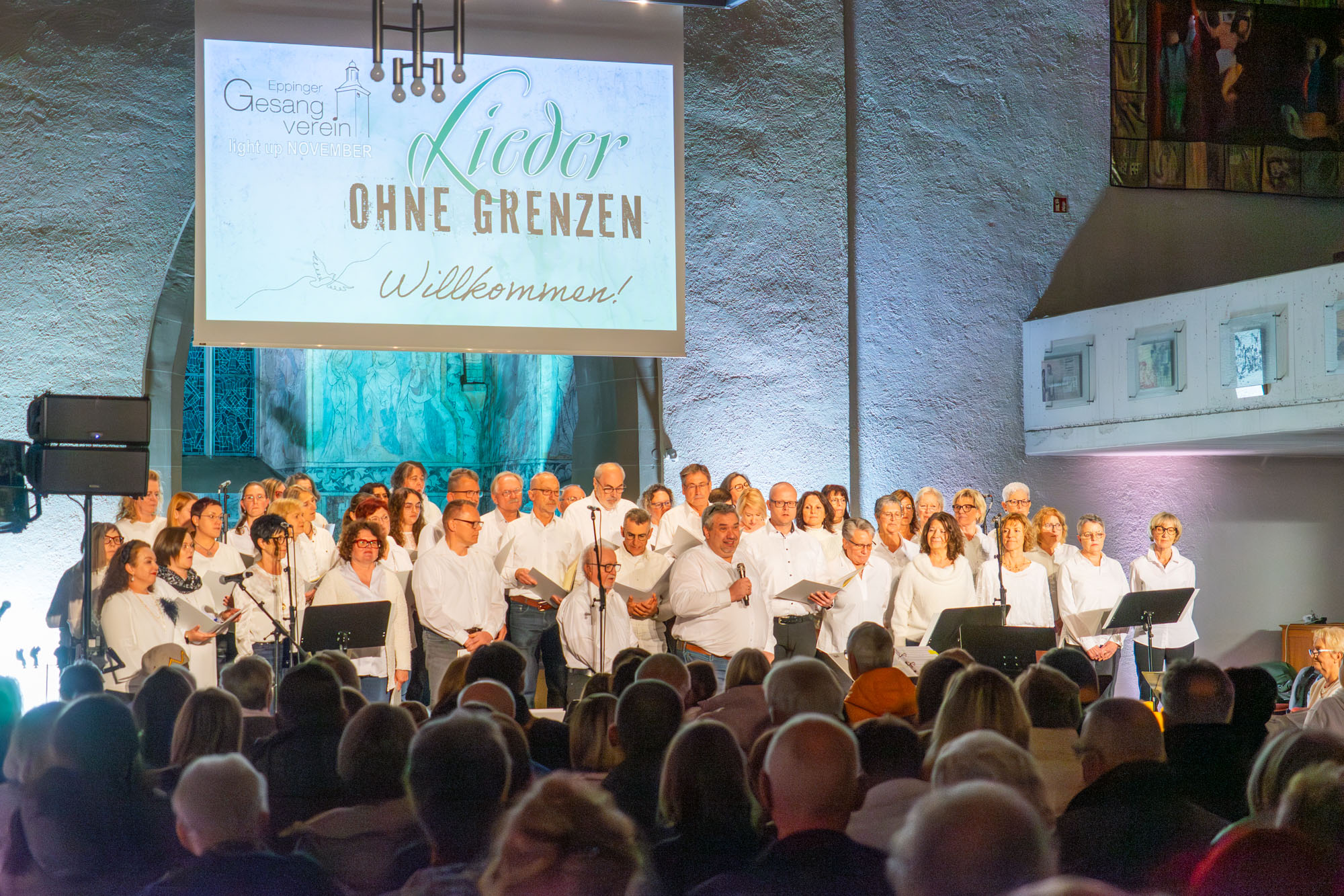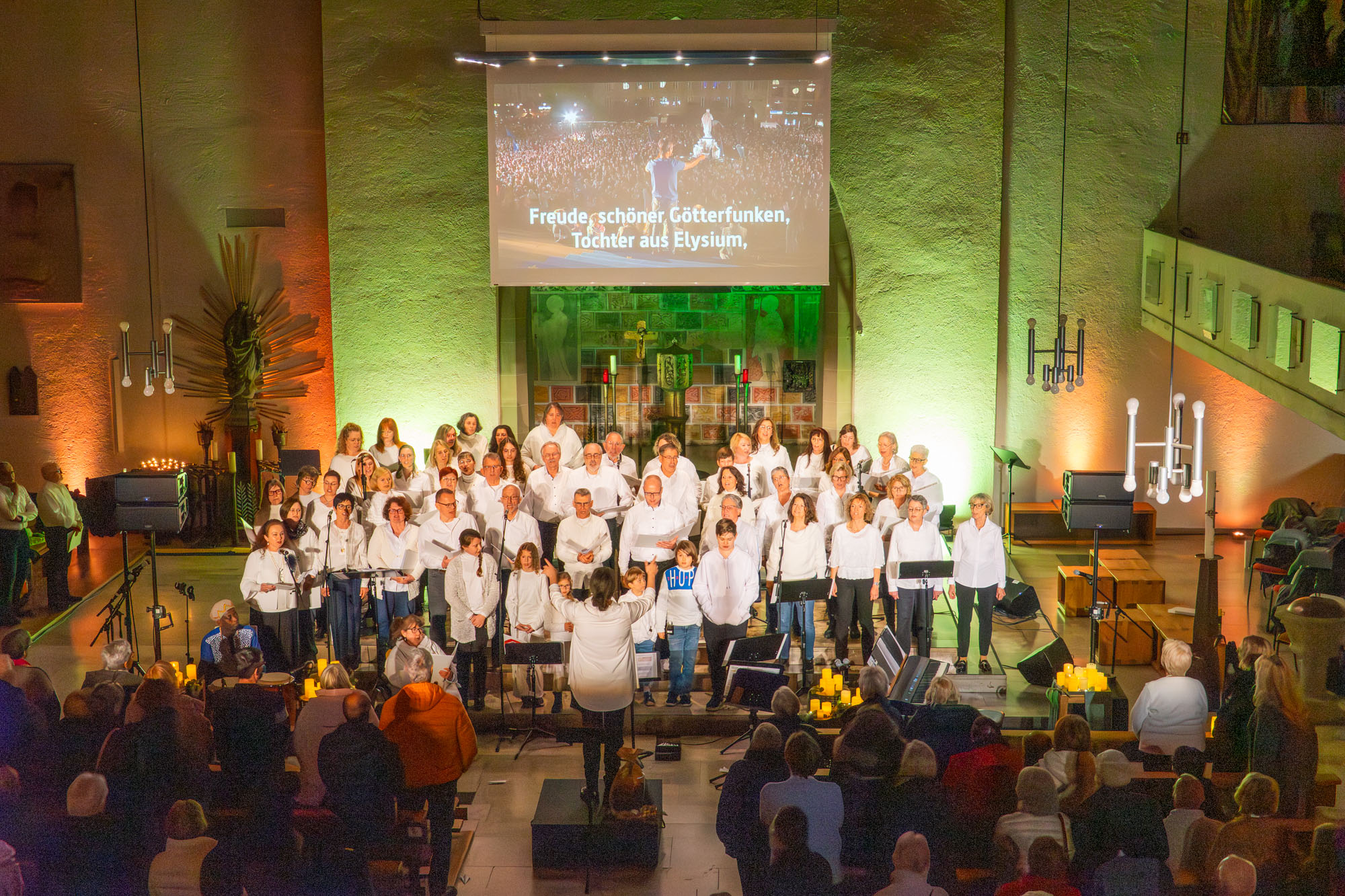Pünktlich um 19 Uhr versammelten sich die knapp 60 „Kraichgau Singers“ um den Altar der Katholischen Stadtkirche und eröffneten mit dem Filmmusiktitel „Conquest Of Paradise“ einen Konzertabend der Extraklasse. Er wurde bereichert durch Videoeinspielungen auf einer großen Leinwand über dem Altar und schließlich sogar dem Text von „Ode an die Freude“ beim großen Finale.