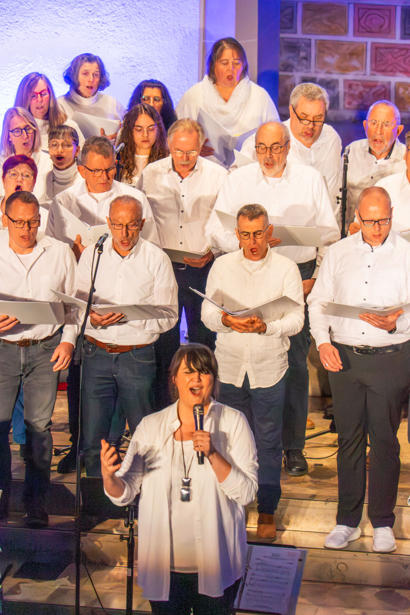 Die Moderation übernahmen abwechselnd Akteure der „KS“ sowie die Holzki-Kinder Lotta und Felix. Alle vier Chöre des Gesangvereins gestalteten ein Programm, das die Besucherinnen und Besucher in dem gut besetzten Gotteshaus begeisterte, bisweilen auch nachdenklich stimmte und das ihnen sicherlich in bester Erinnerung bleiben dürfte. Vereinsvorsitzender Stefan Holzki begrüßte nach dem Auftakttitel die Anwesenden mit launigen Worten, bevor er die Regie für den weiteren Verlauf des Abends seiner Gattin Nelli übergab, die als Chorleiterin bei allen mitwirkenden Ensembles für den richtigen Ton sorgt. Bei dem getragenen Gospel „We Are Not Alone“ glänzten Henrike Gebhard, Elisabeth Jungblut und Beate Wild als Solistinnen – kräftig unterstützt durch die FOLKlassik-Sopranistin Lilia Urbach. Mit „Zombie“, einem kraftvollen Protestsong gegen Gewalt, sorgte der Chor für einen weiteren Gänsehautmoment.