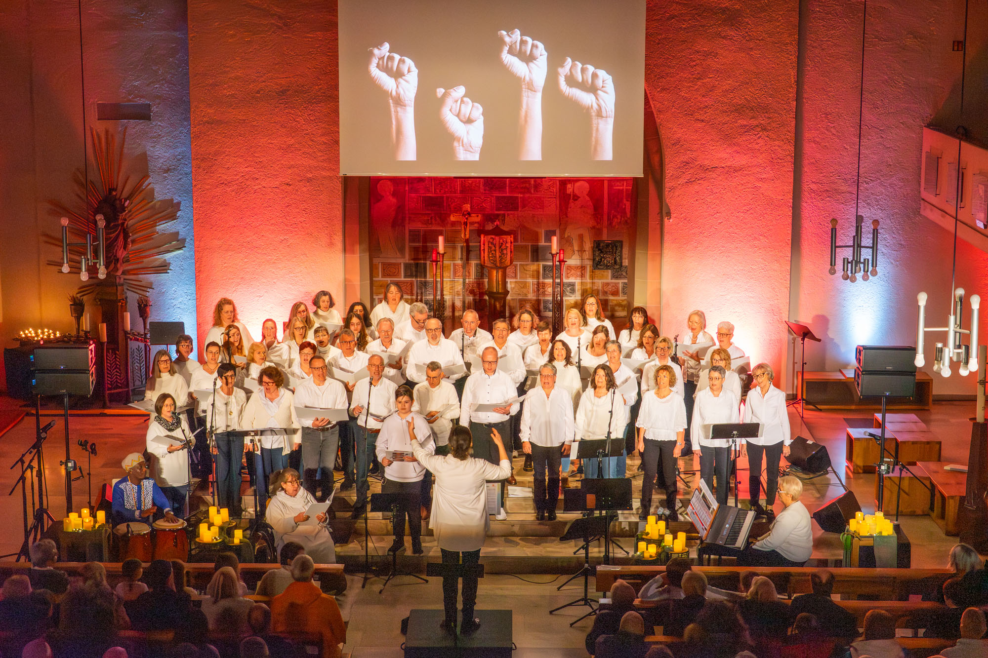 Dann folgte das furiose Finale des Abends: Zunächst erklang das in der afrikanischen Sprache Swahili gesungene „Baba Yetu“ (Vater Unser) mit den Solistinnen Marion Eyer und Lilia Urbach. Bei dem vorletzten Titel des Abends „Hoffnung“ von Peter Maffay kamen die „KidZ 4 Peace“ nochmals nach vorn und sangen kräftig mit. Und den Schlusstitel „Ode an die Freunde“ schmetterten alle Akteure und das Publikum gemeinsam. Dank der Einspielung des Textes auf der Leinwand gab es keinerlei Textprobleme. Zahlreiche Besucherinnen und Besucher lobten gleich im Anschluss in Gesprächen mit den Akteuren und den Vereinsverantwortlichen die gelungene Veranstaltung überschwänglich und bedankten sich für einen sehr schönen Abend.